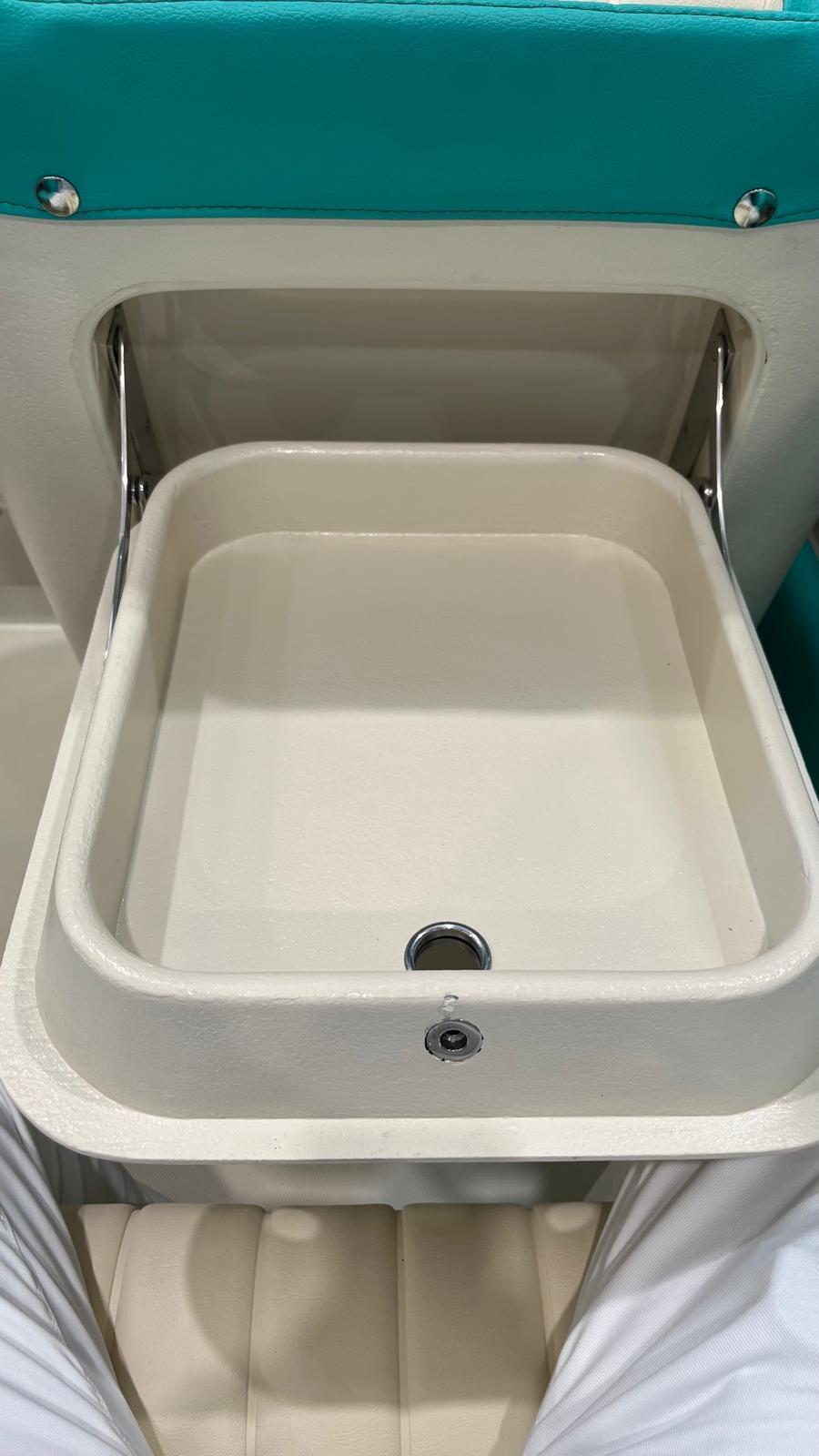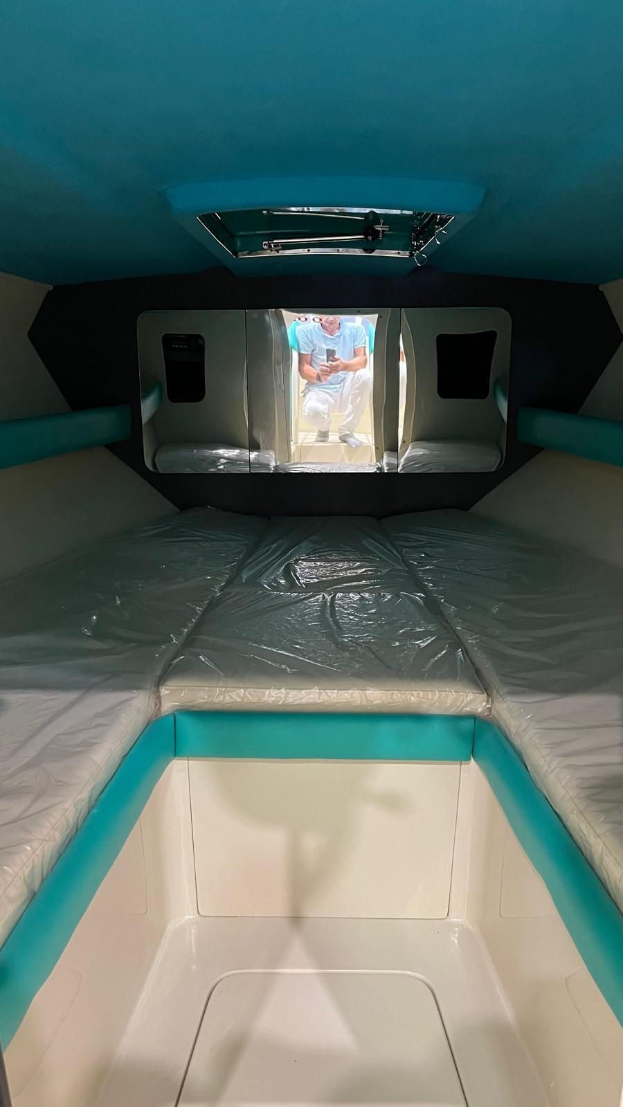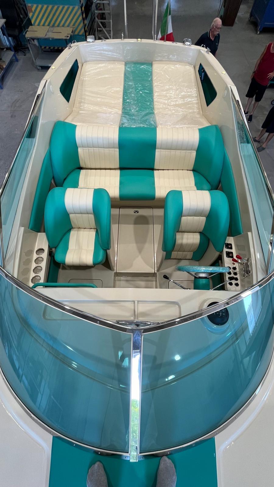 L'une des caractéristiques qui frappe immédiatement est la combinaison de couleurs, avec une élégante association de turquoise et de blanc qui rappelle l'esprit des bateaux sportifs des années 60 et 70, mais avec une fraîcheur contemporaine. Les intérieurs du St. Tropez 211 sont tout aussi soignés, avec des sièges recouverts de cuir, également dans des tons turquoise et blanc, offrant à la fois confort et esthétique agréable. Les sièges sont disposés de manière à favoriser la convivialité à bord, permettant aux passagers de profiter du soleil et du paysage en toute détente.