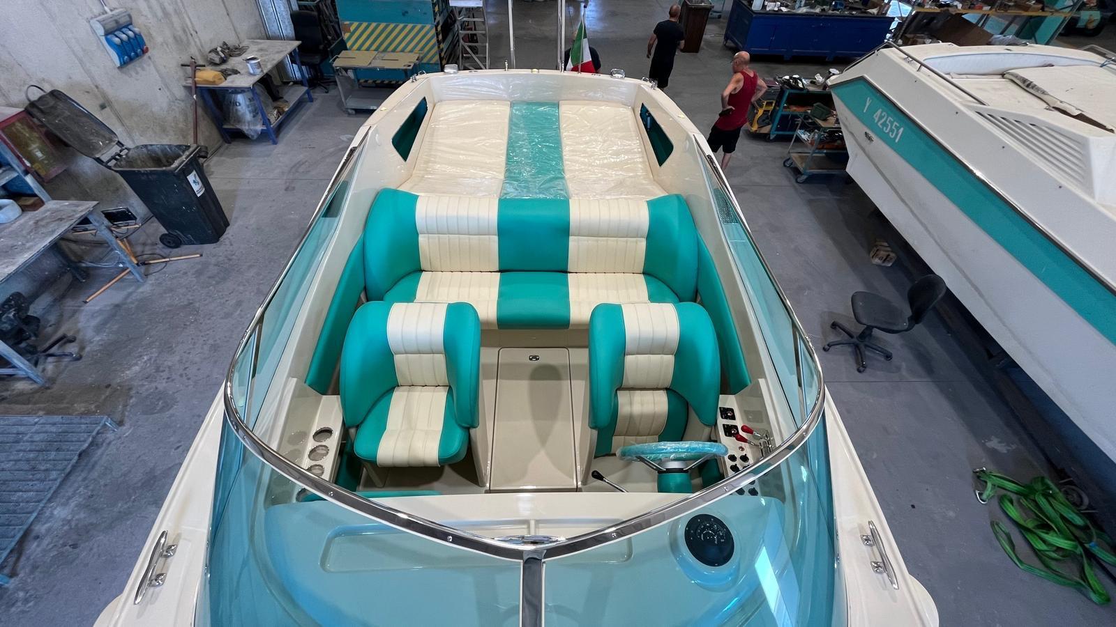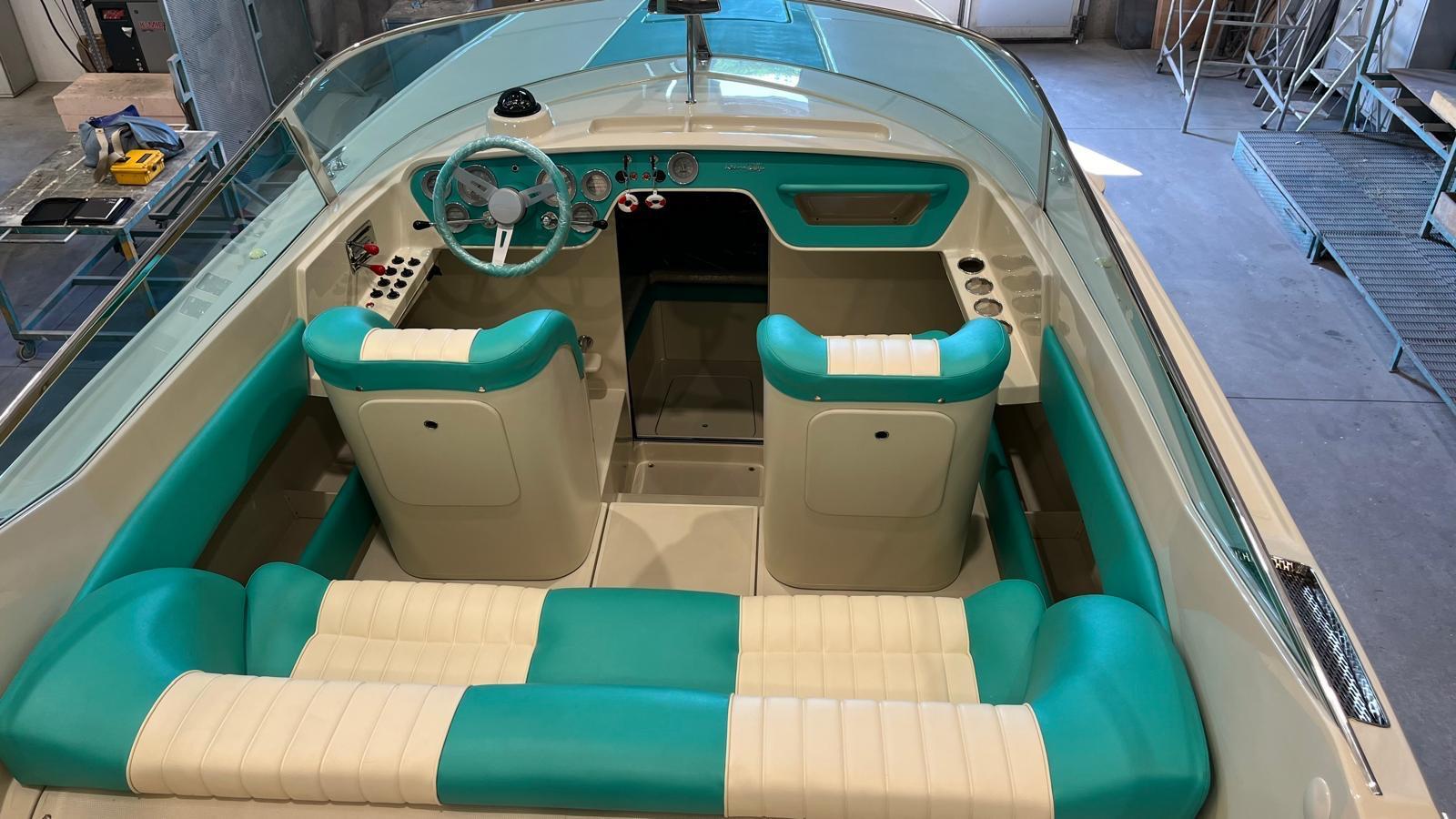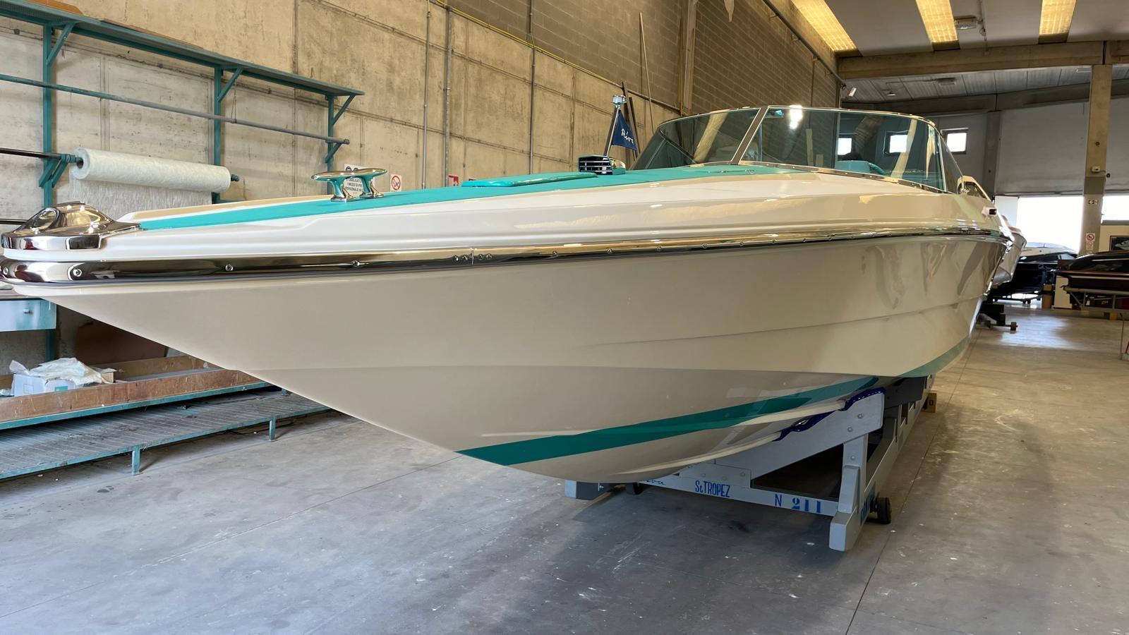 Le bateau St. Tropez 211 a subi une restauration complète, avec un traitement anti-osmose réalisé pour garantir sa durabilité dans le temps. La ligne de flottaison a été finie avec une élégante couleur turquoise Riva, rappelant le style classique de ces embarcations. L'arbre d'hélice a été complètement démonté et révisé, avec le remplacement des joints pour assurer des performances optimales. Le système électrique a été refait à neuf, ainsi que le compartiment moteur, maintenant entièrement rénové.