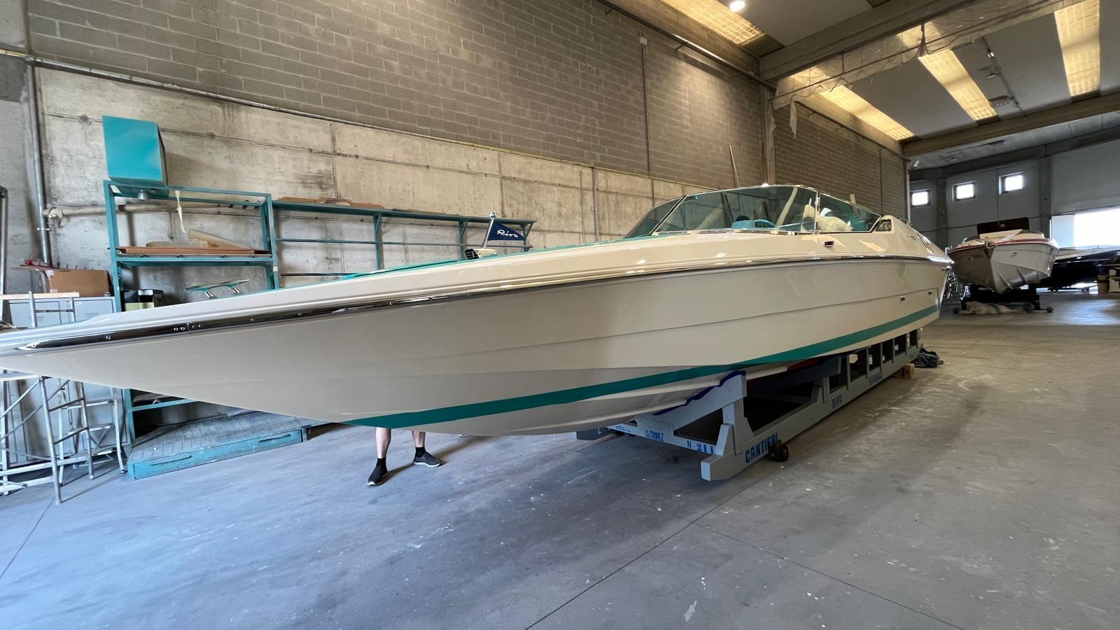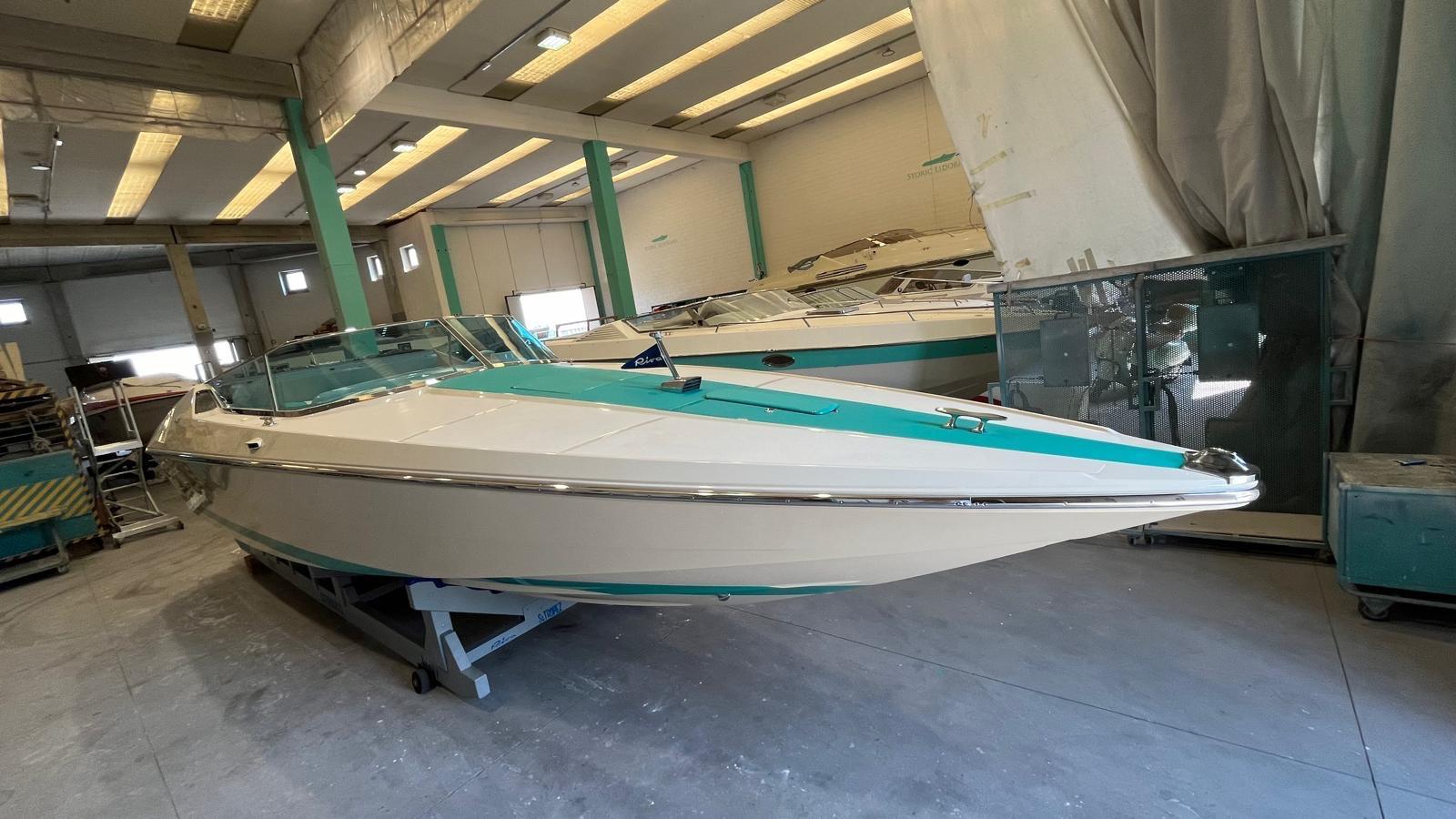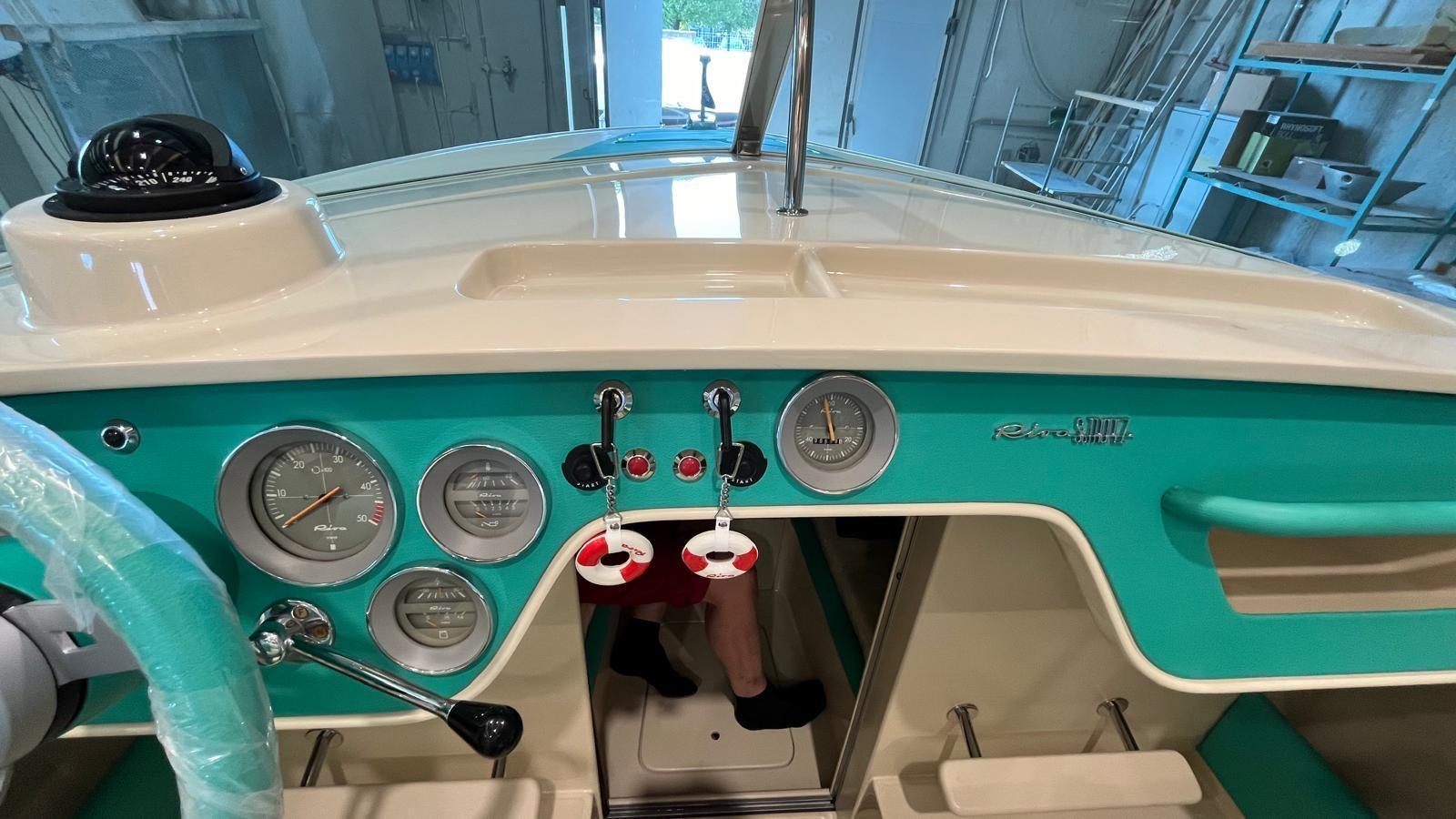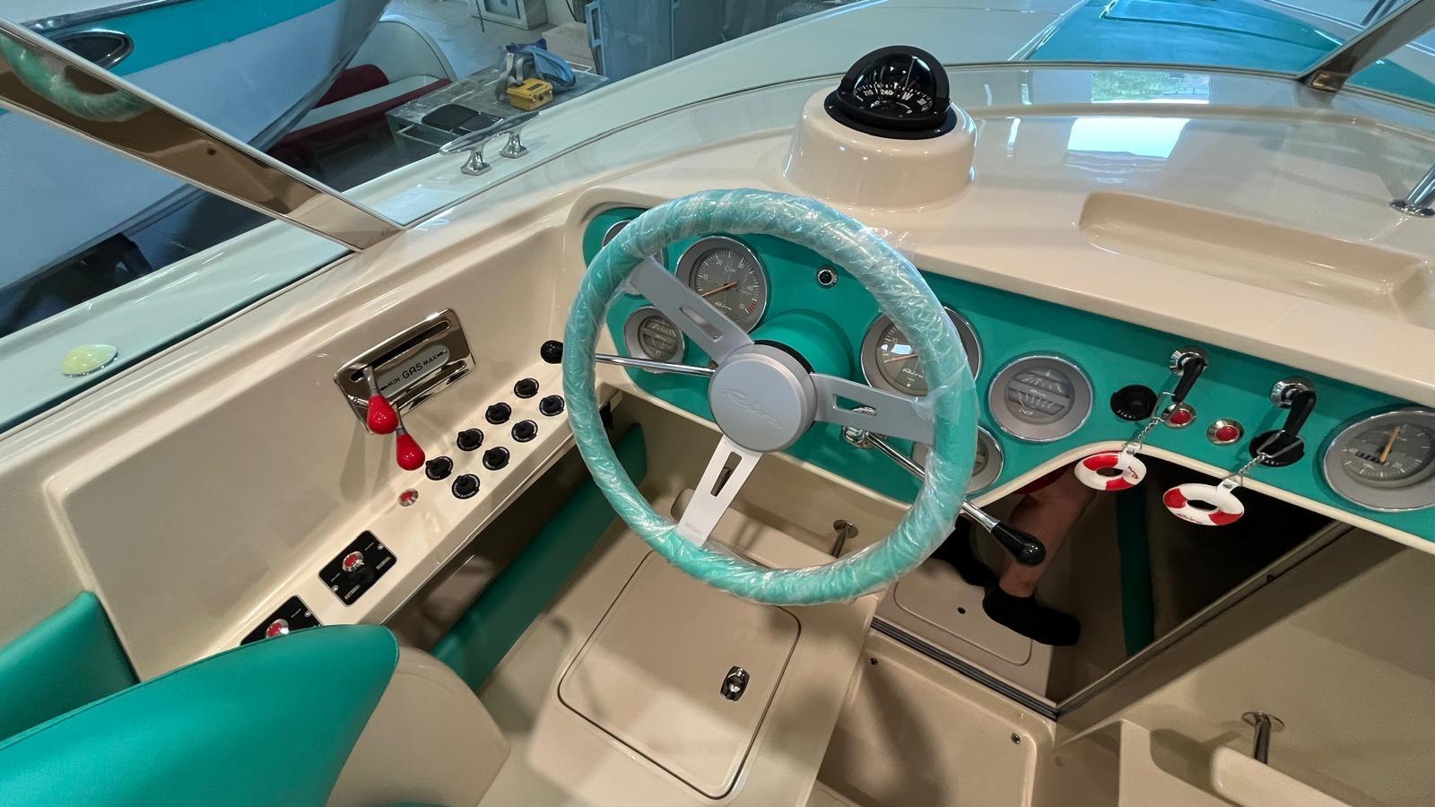 Le bateau St. Tropez 211 a subi une restauration complète, avec un traitement anti-osmose réalisé pour garantir sa durabilité dans le temps. La ligne de flottaison a été finie avec une élégante couleur turquoise Riva, rappelant le style classique de ces embarcations. L'arbre d'hélice a été complètement démonté et révisé, avec le remplacement des joints pour assurer des performances optimales. Le système électrique a été refait à neuf, ainsi que le compartiment moteur, maintenant entièrement rénové.