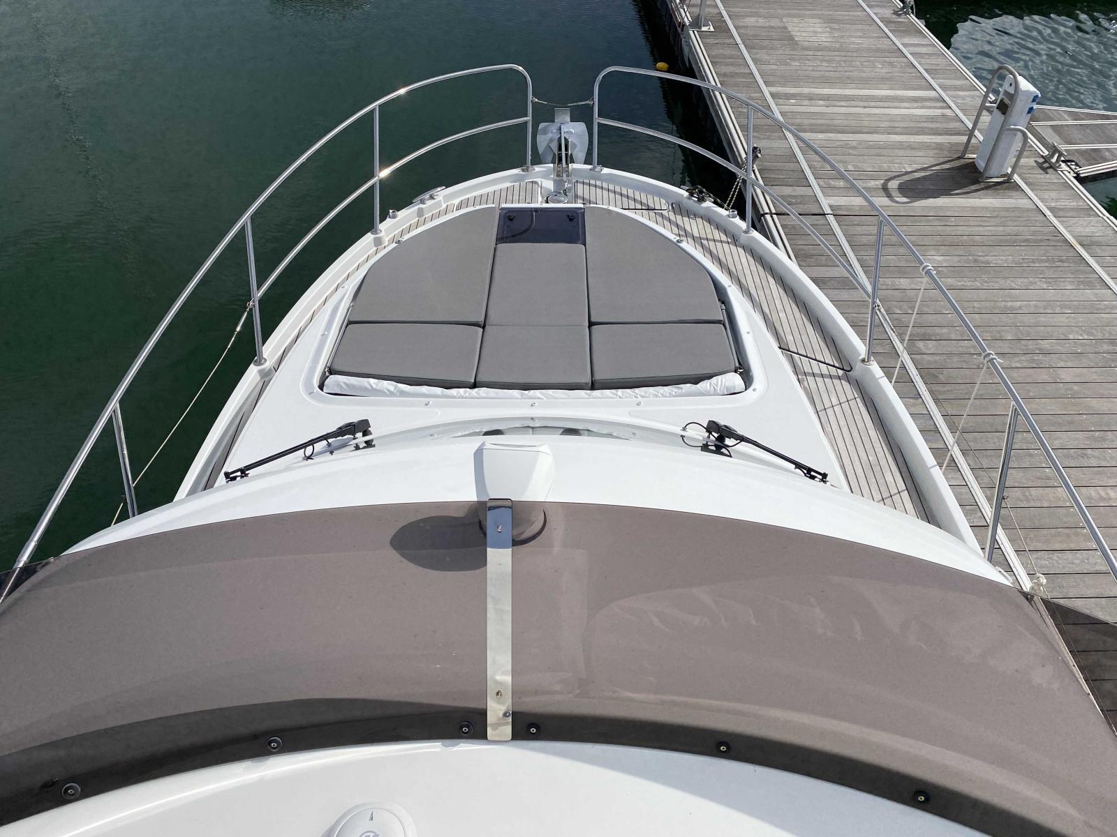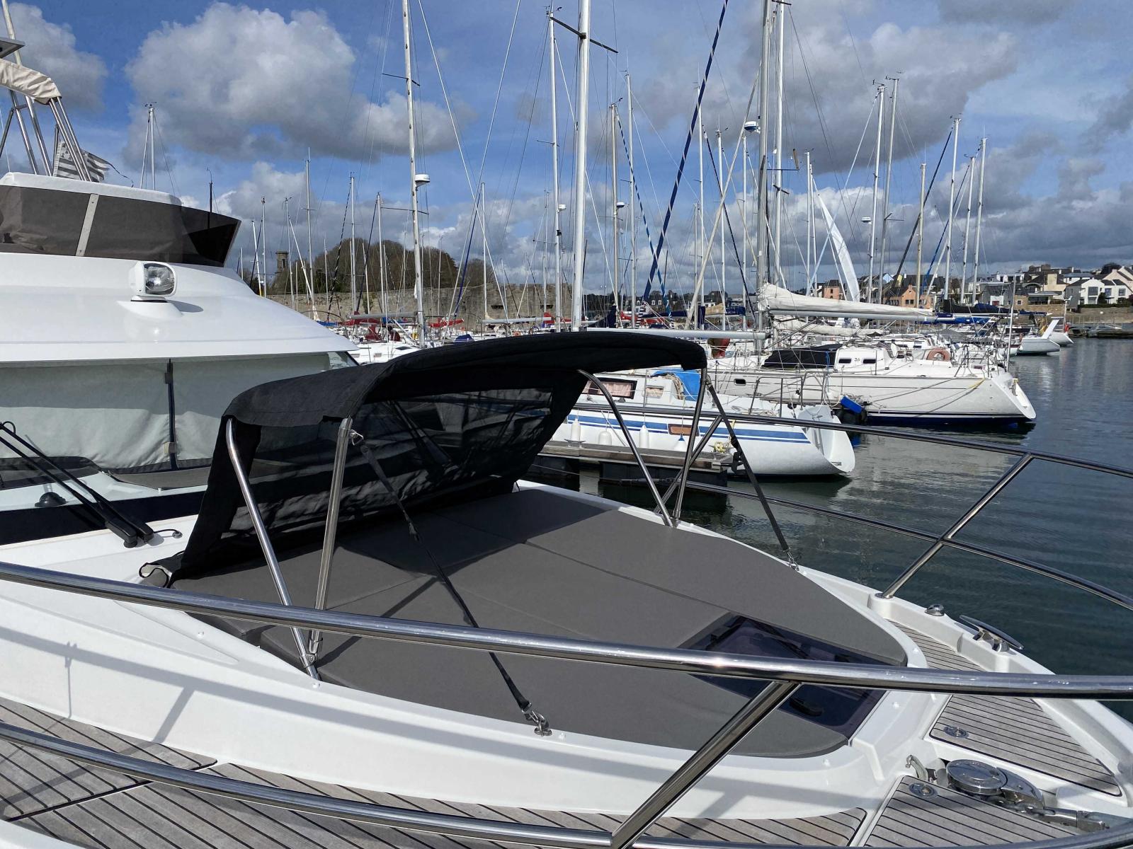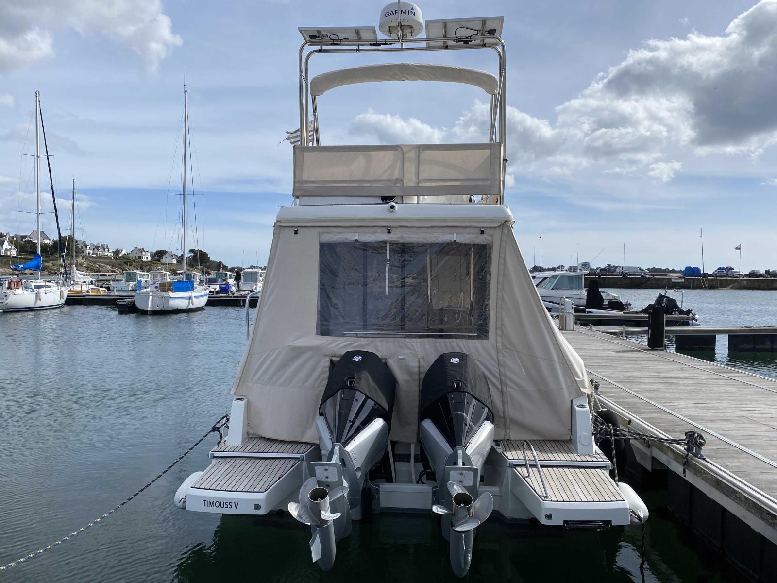 Coque Blanche, Finition Elegance, cockpit - plateformes de bain et passavants lattés teck massif, Taud de fermeture arrière avec rideaux occultants, cagnards de flybridge et Bimini de flybridge, housses de protection de flybridge, Bain de soleil avant avec canopy et housse de protection, Plateforme de bain latérale électrique, 4 Batteries de services AGM avec contrôleur de charge, Convertisseur 12-220V 3000 Kva, Circuit 220V avec chargeur de batteries, Réfrigérateur + Réfrigérateur 80L Supplémentaire, Four micro-onde, Réchaud fixe 2 feux cuisine, Chauffe Eau 220V, Guindeau électrique avec compteurs de chaine timonerie et flybridge, Propulseur d'étarve, Electronique complète GARMIN avec GPSMap 1223 au fly et GPSMap 8416 en timonerie, Radar Garmin et Camera arrière Garmin, VHF Double poste RT850 AIS, système audio Fusion, Projecteur de pont, Meubles de rangements haut dans timonerie et cabine avant, Matelas sur-mesure cabine arrière, WC Electrique eau douce, Carré transformable.