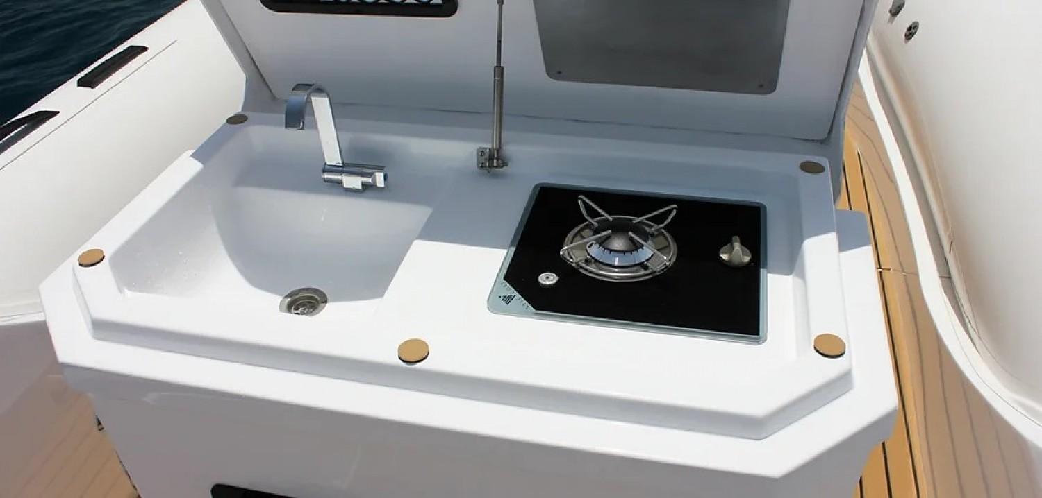 Siège de conduite debout équipé d'un poste de cuisine comprenant un évier et prêt pour un réfrigérateur et une cuisinière électriques