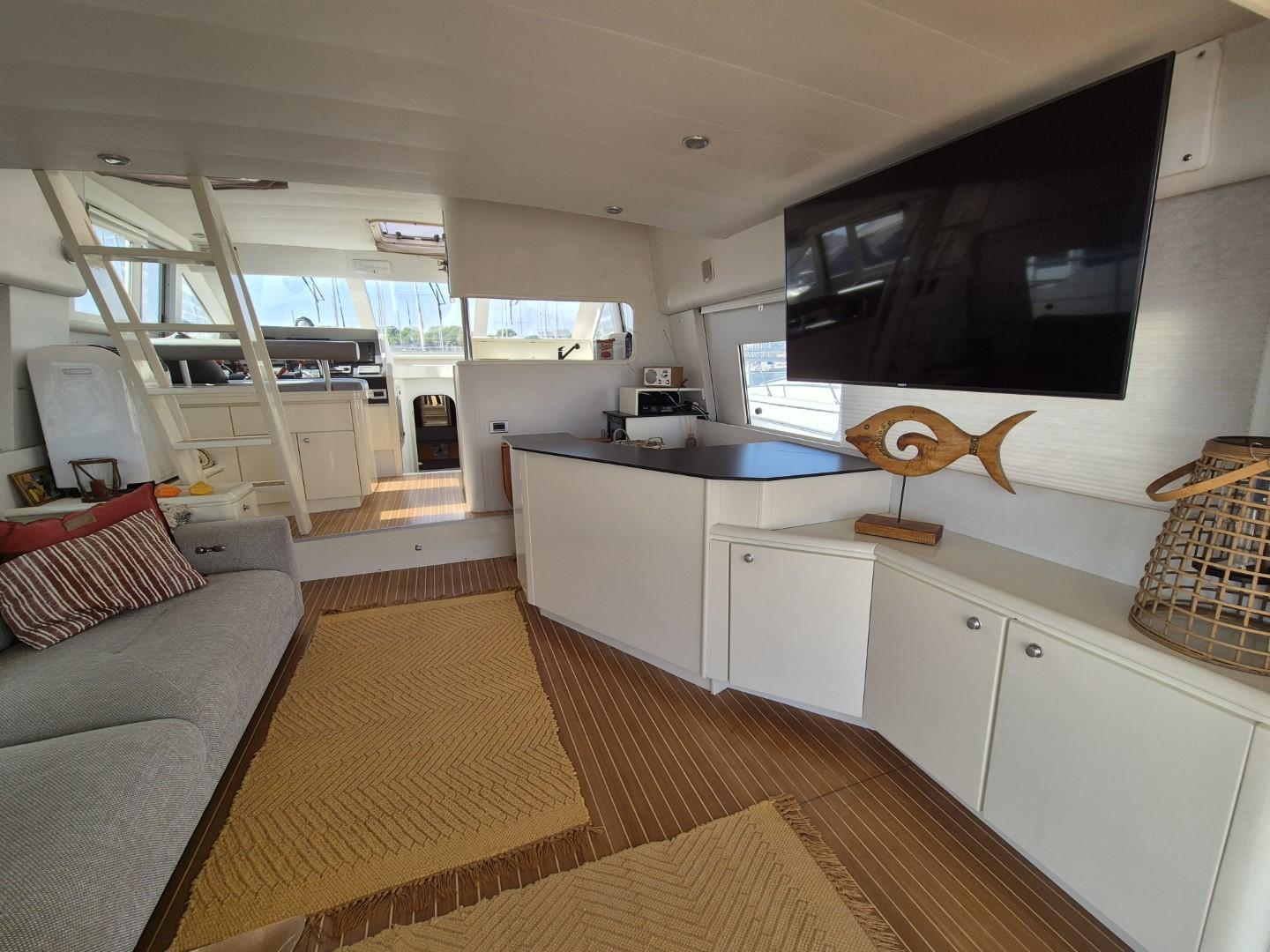Ce Guy Couach 1602 offre de très beaux volumes, un salon avec un comptoir, un canapé convertible électriquement en couchage (possibilité de remettre en le salon en configuration d origine, avec les banquettes), une cuisine équipée donnant sur la coursive tribord par une porte. Au poste de pilotage, également une porte donnant sur la coursive. En contrebas 3 cabines doubles avec chacune une salle d'eau avec douche et WC électrique.