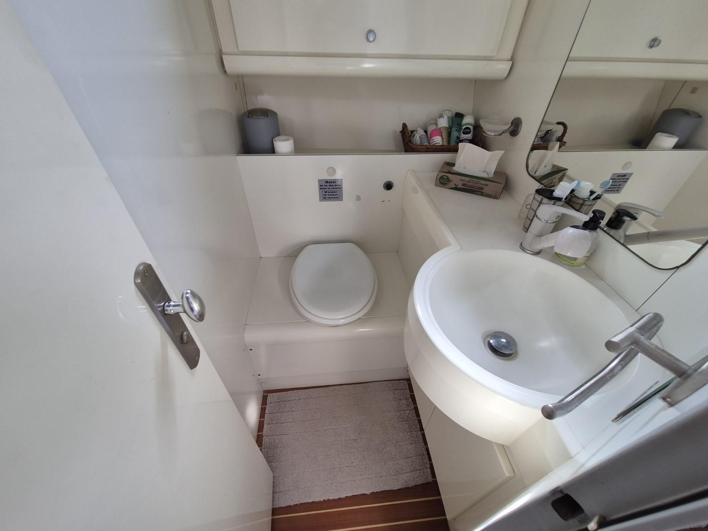 Sur le pont avant, accès à la cabine marin avec salle d'eau.