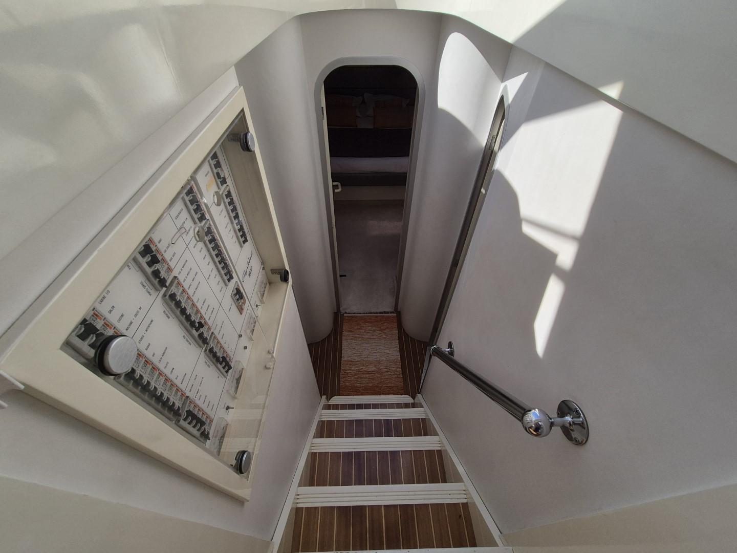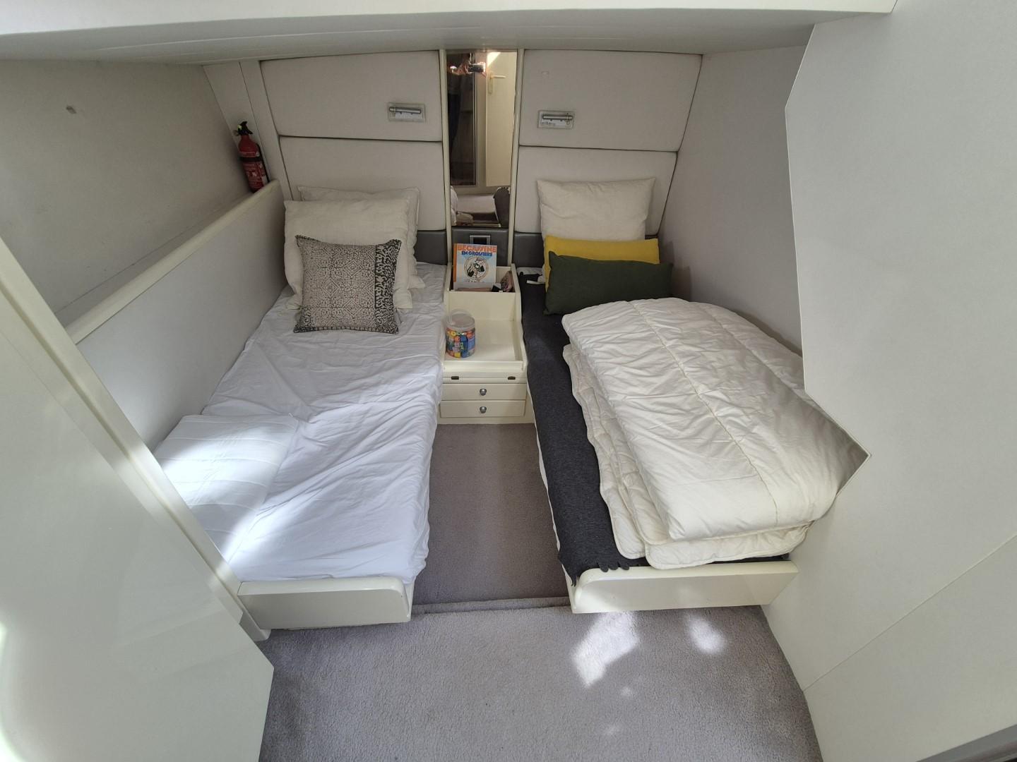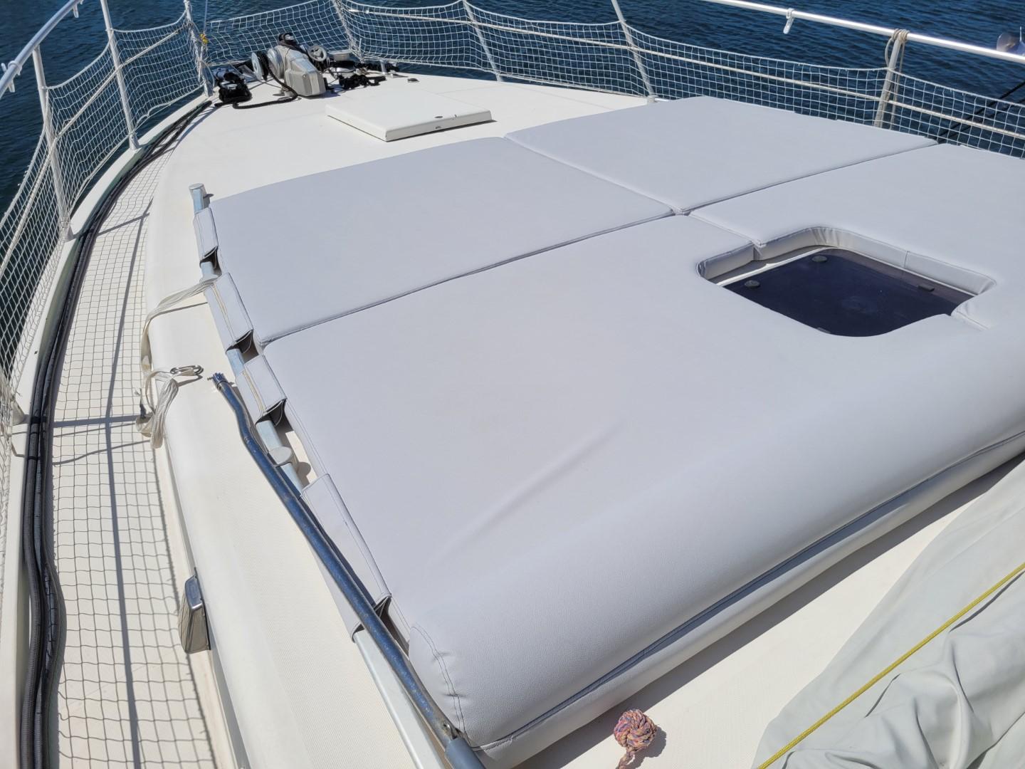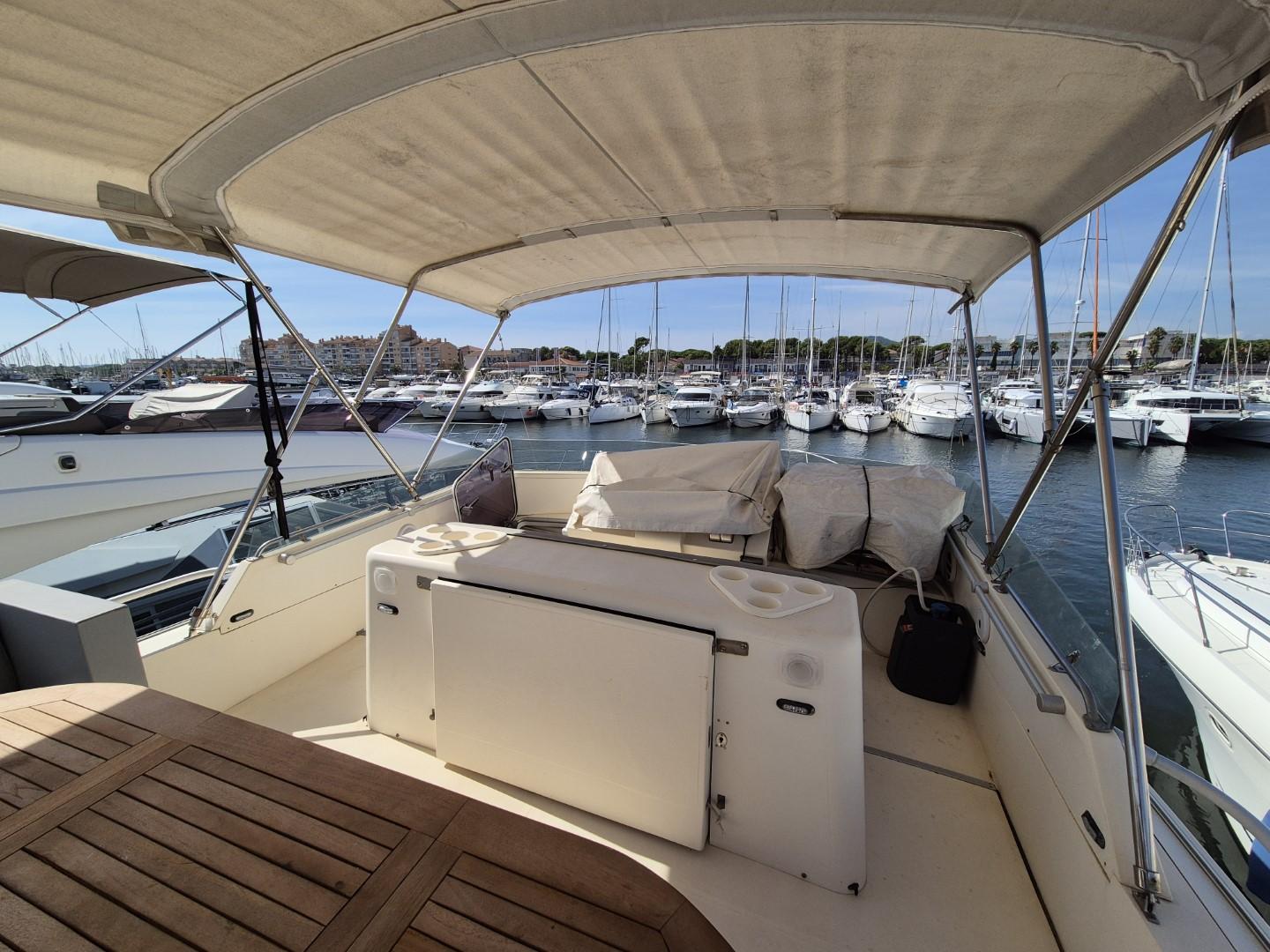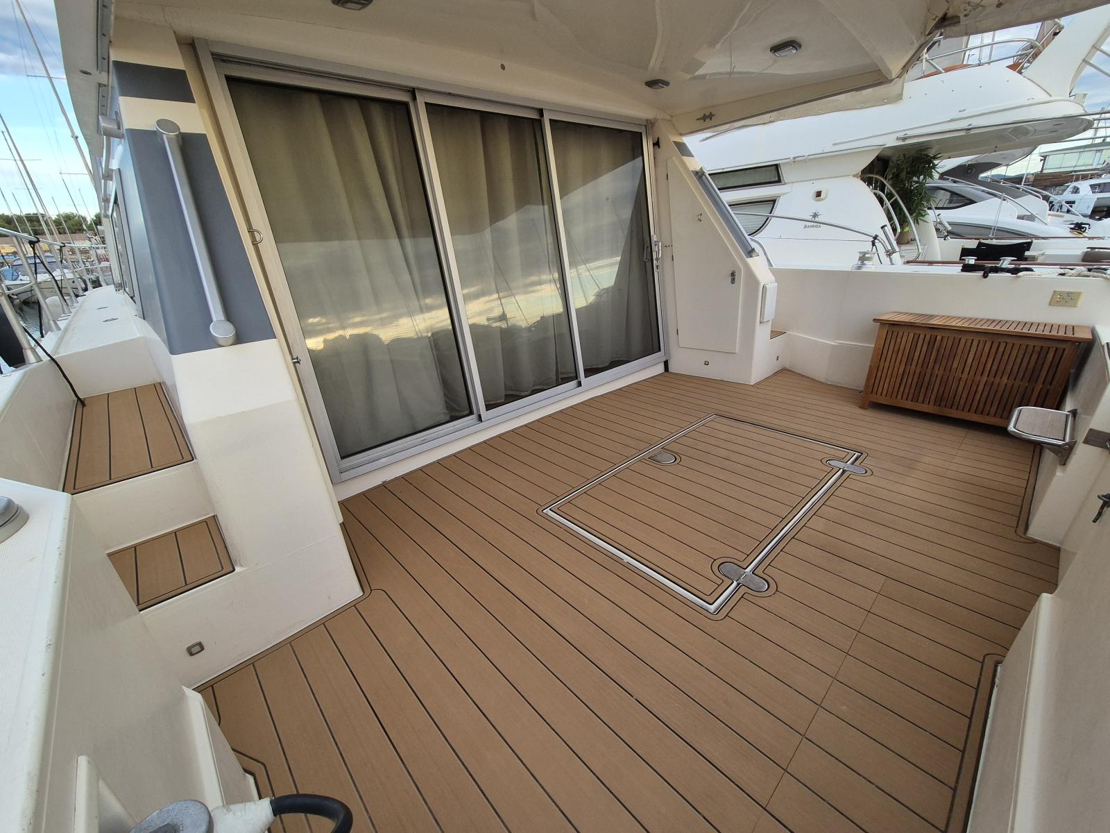 Passerelle hydraulique, 2 winches électriques arrière, taud de cockpit ajouré plus taud occultant blanc. Au fly : bimini plus kit camping. Grand bain de soleil avant. revêtement du cockpit et plage de bain neuf en Silverteck , annexe neuve avec moteur.