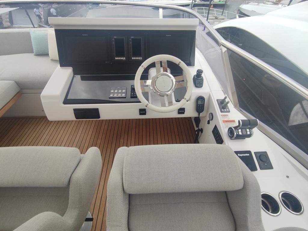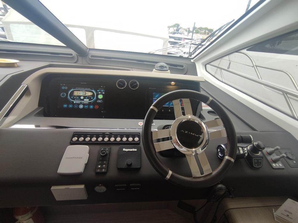 AIS Raymarine, Pilote automatique, compteur de chaîne, sondeur, joystick de manœuvre, 4 traceurs Raymarine, Antenne radar Raymarine 72MN, propulseur d’étrave, propulseur de poupe, volets hydrauliques, Seakeeper NG16, 3ème poste de manœuvre dans le cockpit (joystick et propulseurs), dessalinisateur 300l/h
