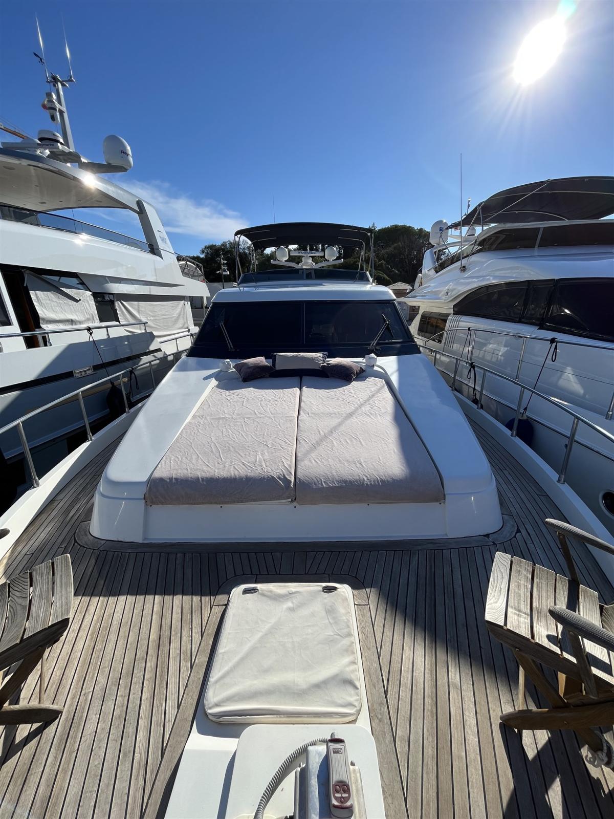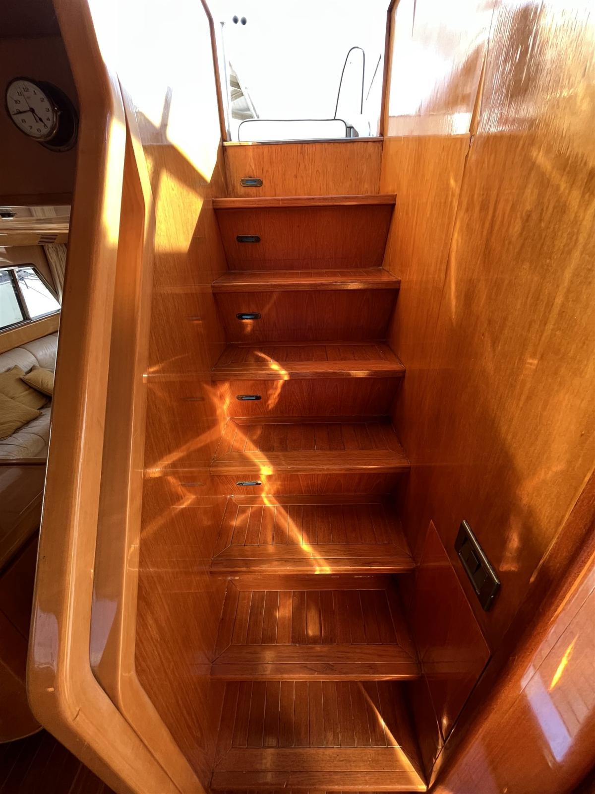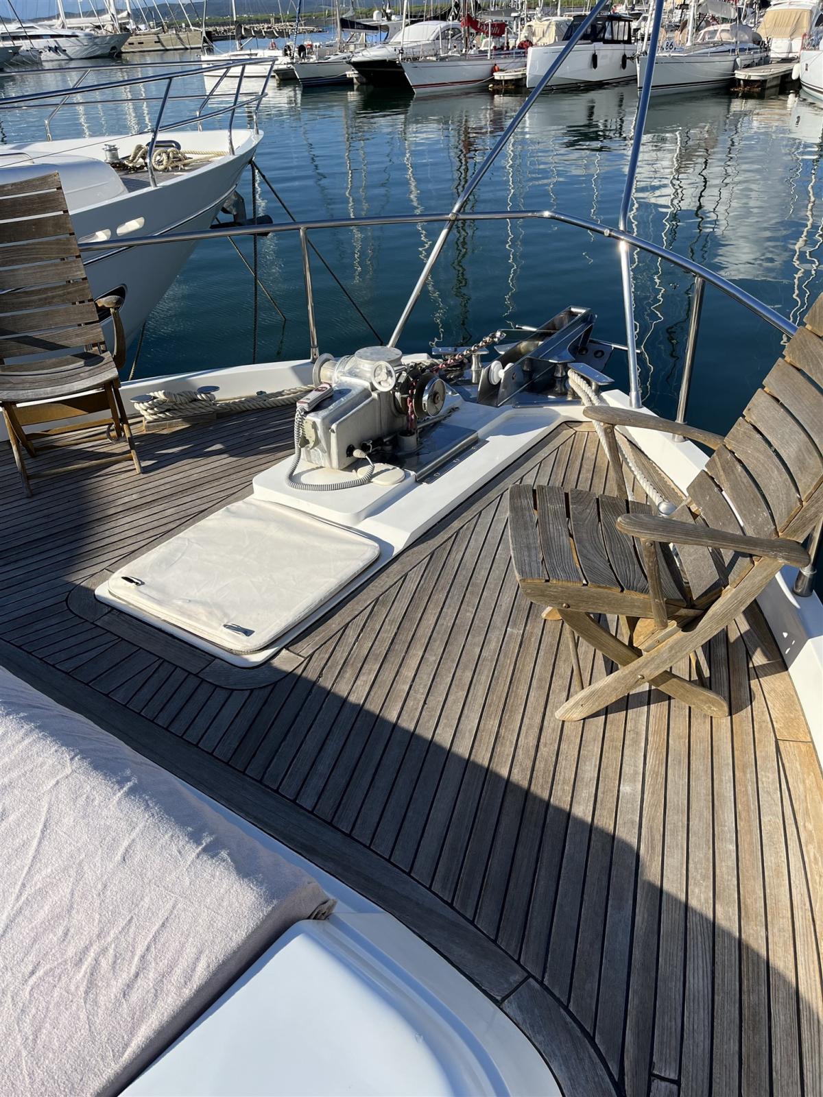 Alarme moteur, Alarme de pompe de cale, Eau sous pression, 24 Batteries, Douche de cockpit, Double barre à roue, Flaps hydrauliques, Extincteur(s) fixe(s) (in tutti gli ambienti), Lavage de chaine, Passerelle (Idraulica), Plateforme arrière, 4 Pompe de cale électrique (+ zona cabine), Pompe de cale manuelle, Cockpit en teck, Guindeau électrique, Echelle de bain, table de cockpit, Annexe (Eurovinil 270 Yamaha 4T 4HP), 2 Winch électrique arrière.