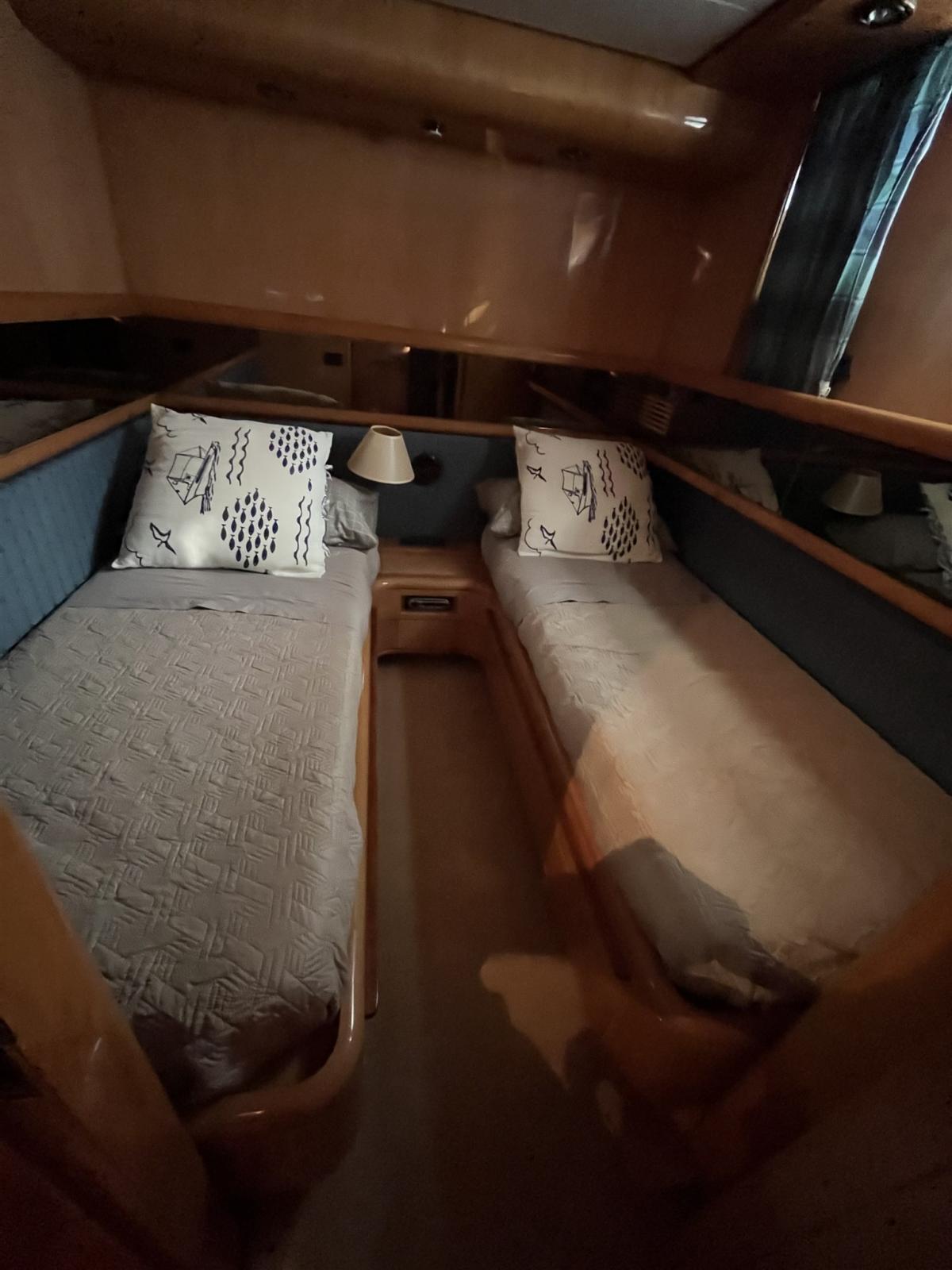 hélices à 5 pales ; 2009 : révision totale des moteurs ramenés à zéro heure, toujours entretenus par l’atelier MAN après 300 heures de révision à partir du 7.2023 ; Bruce 50 kg. ; Volez avec terrasse française, 2 chaises longues, table en mosaïque 150x 75, caméra de la salle des machines ; 2 feux de plongée à l’arrière ; ; 2022 NOUVEAU : 24 batteries ; l’autogonflage 12 personnes expire en 2025 ; Octobre 2023 à mai 2024 : révision des échangeurs et onduleurs, révision de la climatisation ; révision : timonerie, volets, passerelle hydraulique Nouveau : chargeurs à plate-forme en teck, antenne TV, plaque à induction, lave-vaisselle, lave-linge ; 2025 : Aménagement pont en teck ; 5 % de frais de courtage + 22 % de TVA à la charge de l’acheteur (la TVA est calculée uniquement sur le montant des frais de courtage)