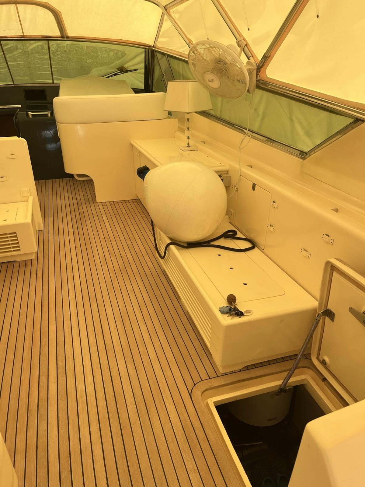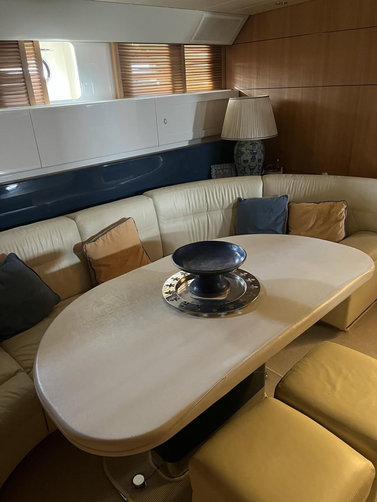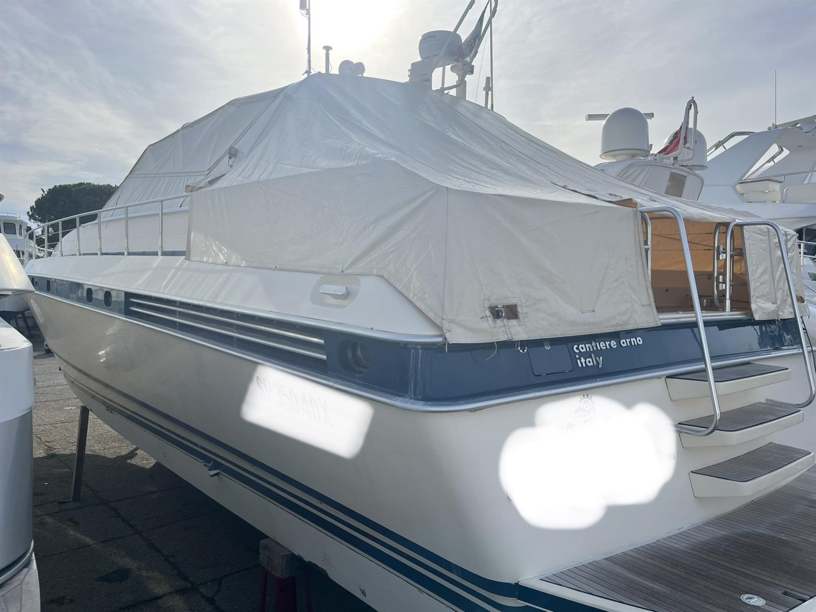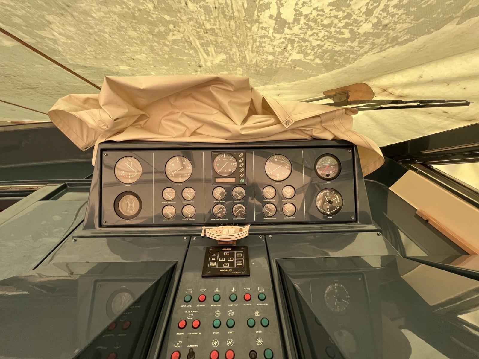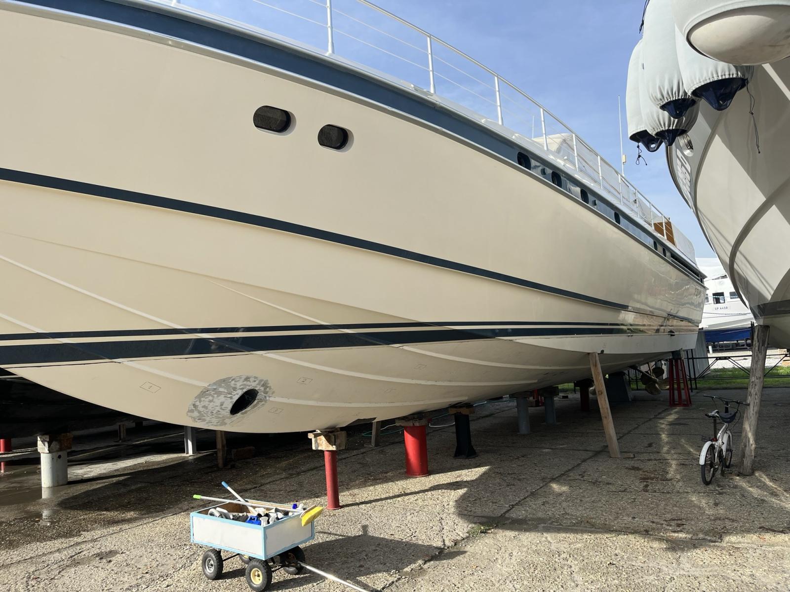 Alarme gaz, Alarme moteur, Alarme de pompe de cale, Ouverture du compartiment moteur électrique, Ligne d'arbre de rechange, Eau sous pression, Couleur spéciale (scafo colore crema), Douche de cockpit (calda e fredda), Phare de poursuite, Flaps électriques, Flaps hydrauliques, Garage à annexe (con grutte besenzoni elettrica), Extincteur(s) fixe(s), Indicateurs de flaps, Lavage de chaine, Lavabo dans le cockpit, Éclairage de courtoisie, Spots sous-marins, Passerelle (idraulica), Plateforme arrière, Pompe de cale automatique, Pompe de cale manuelle, Cockpit en teck, Prise de quai, Onduleur, Rollbar, Guindeau électrique, Echelle de bain, table de cockpit, Annexe, Winch électrique arrière, Winch électrique avant.