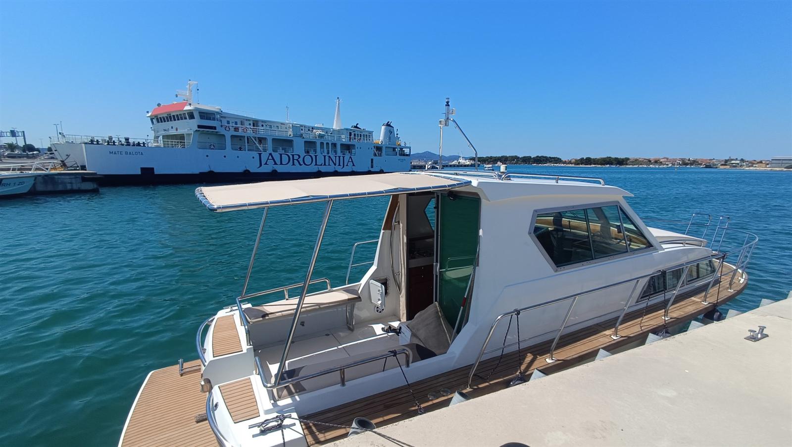 lumières sous-marines ; Lumières LED ; hauteur intérieure minimale 1,90 ; rénovation totale 2018, après 20 heures effectuées ; à vitesse de croisière 18 nœuds, consommation 34 L/H ; août 2024 : révision du moteur et de la turbine ; 5% de commission de courtage + 22% de TVA à la charge de l’acheteur (la TVA est calculée uniquement sur le montant de la commission)