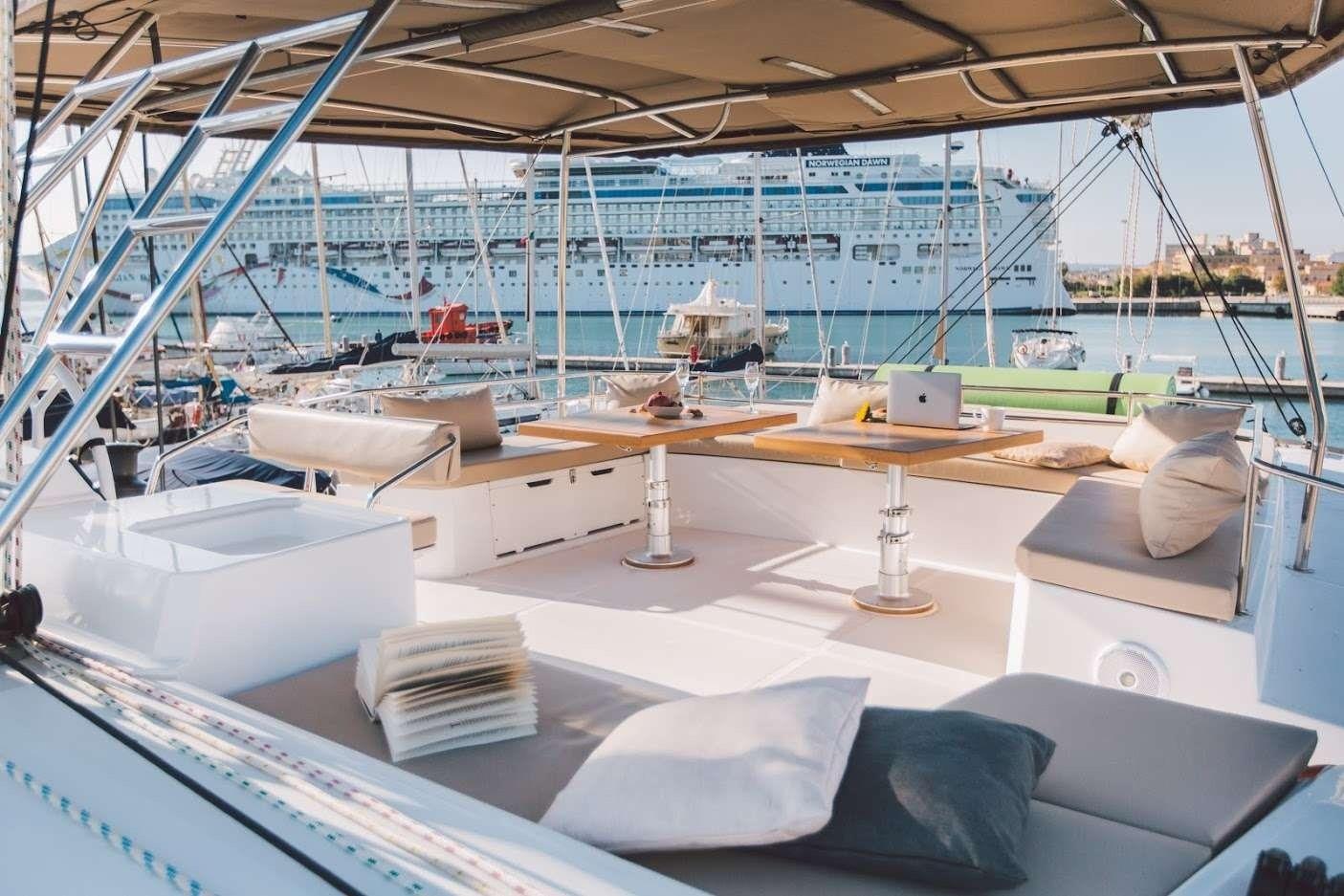 Bateau de location ; Version 5 cabines + 2 cabines équipage 3 couchettes ; radeau de l’année 2018 ; 5 cabines, 4 salles de bain avec douche, 2 cabines d’équipage ; toilettes électriques à eau douce ; Pont Flyi ; frais de courtage de 5% + TVA 22% à la charge de l’acquéreur (la TVA est calculée uniquement sur le montant du courtage)