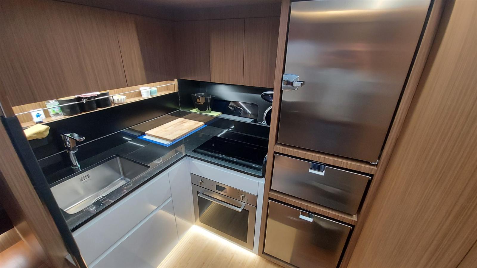 Cuisine (con piano cottura ad induzione Smeg), Four (digitale combi Smeg), Réfrigérateur extérieur (a cassetto in pozzetto), Réfrigérateur intérieur (e freezer Frigonautica).