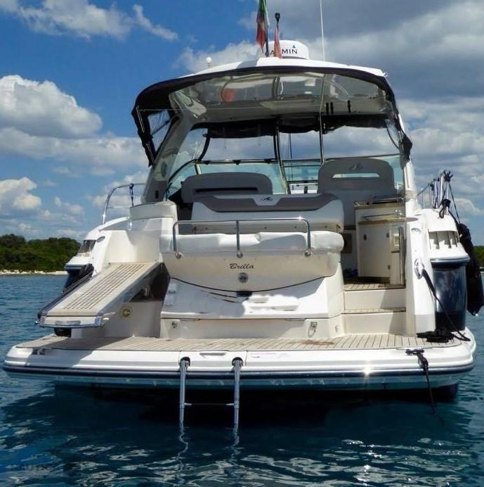 Alarme gaz, Ancre (20 Kg e 100 Catena), 4 Batteries, Douche de cockpit, Phare de poursuite, Flaps électriques (Zipwake), Hard top, Indicateurs de flaps, Spots sous-marins, Passerelle (Idraulica), Plateforme arrière, Prise de quai, Connexion eau sous pression à quai, Rollbar (Hard Top), Guindeau électrique, Echelle de bain, table de cockpit, Corne, T-Top.