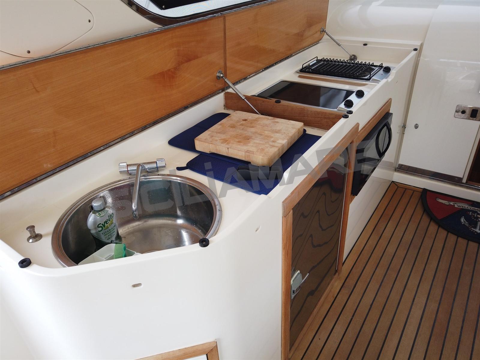 Alarme moteur, Eau sous pression, Passavant en teck, Douche de cockpit, Flaps hydrauliques, Hard top (Electric), Indicateurs de flaps, Passerelle (Hydraulic 3 sfili), Plateforme arrière, Pompe de cale automatique, Cockpit en teck, Prise de quai, Guindeau électrique, Echelle de bain, table de cockpit.