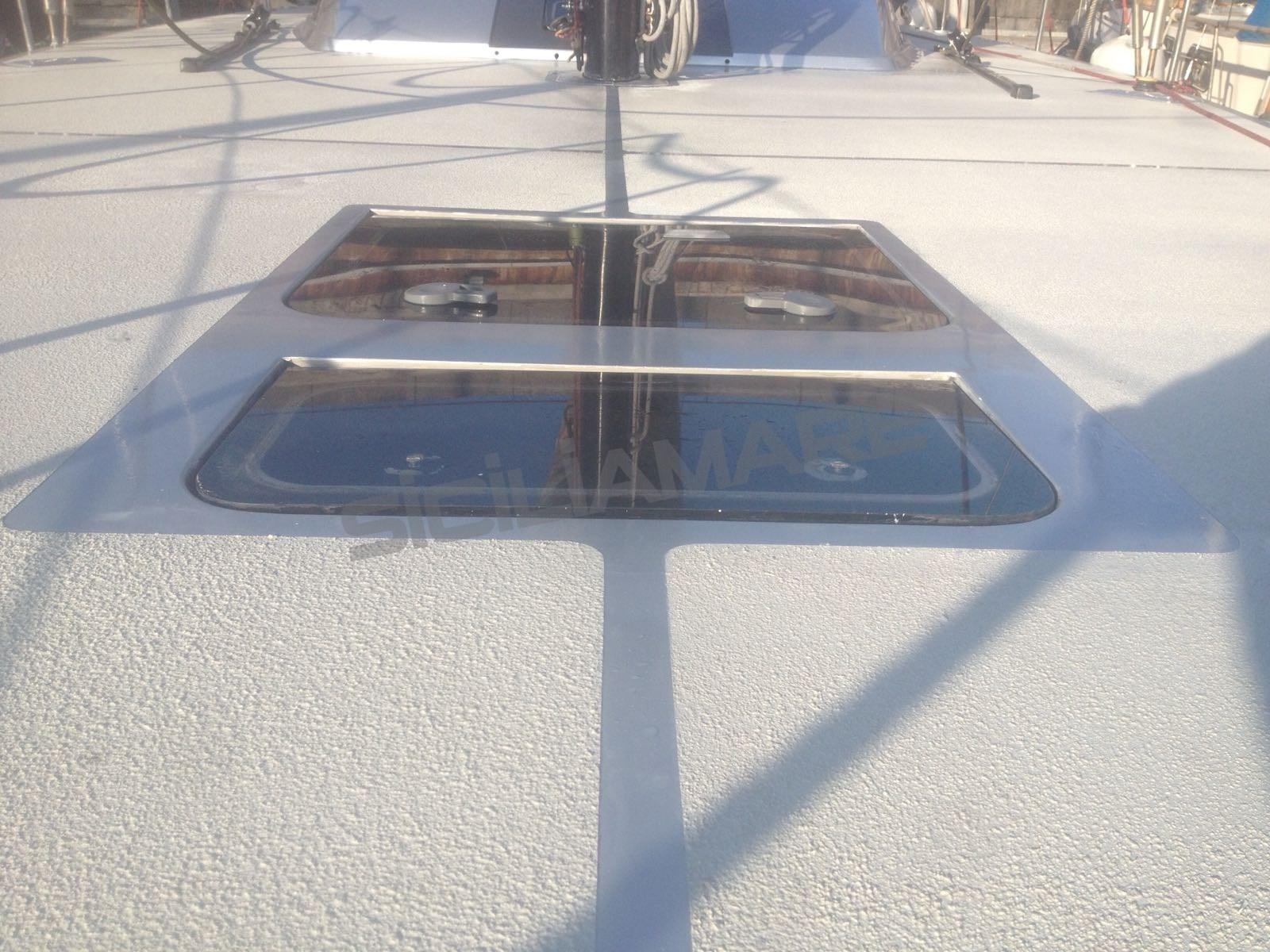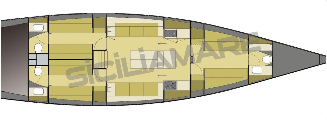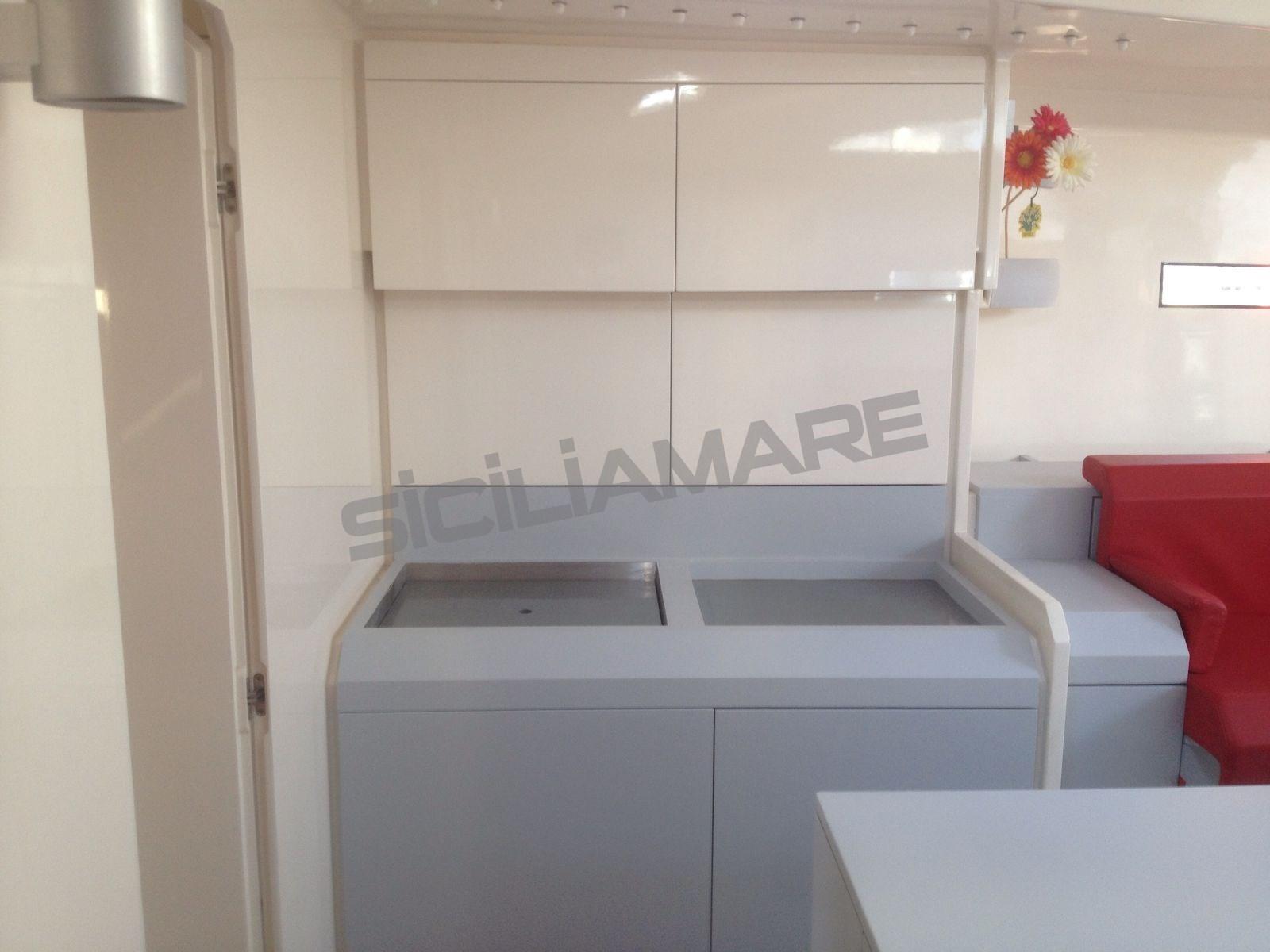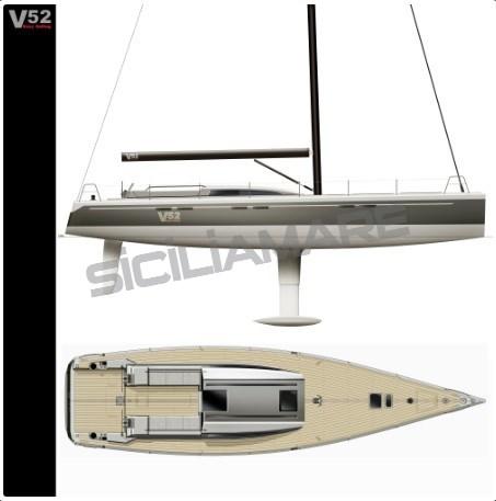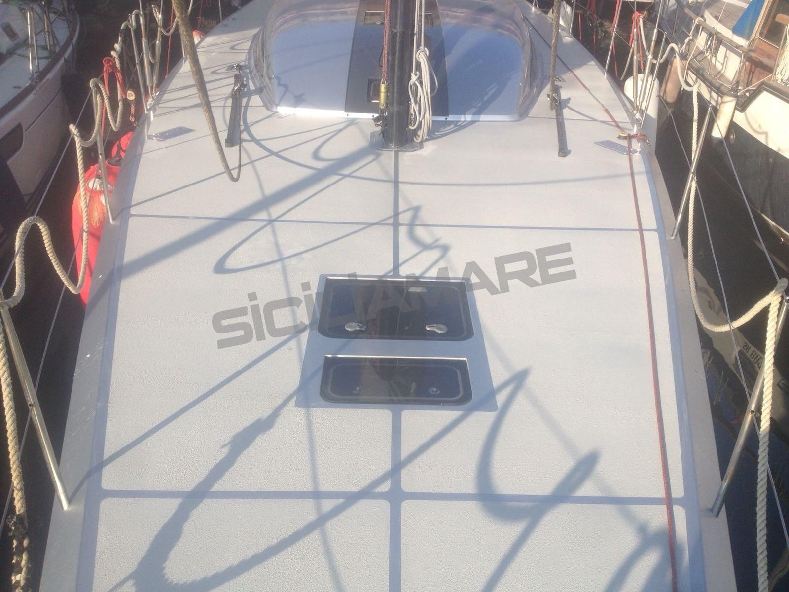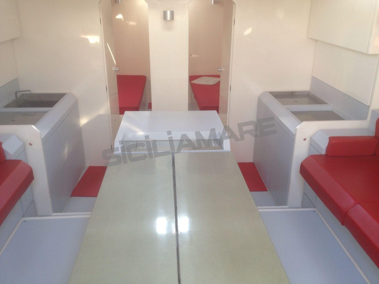 Alarme moteur, Ancre (custom Vismara), Eau sous pression, Chargeur de batterie (100 Ah), Douche de cockpit, Éclairage de courtoisie, Moteur d'annexe (FB tender), Passerelle (carbonio), Cockpit en teck, Prise de quai, Gréement Rod, table de cockpit (a scomparsa), Annexe, 3 Winch électrique (Harken custom 3 v).