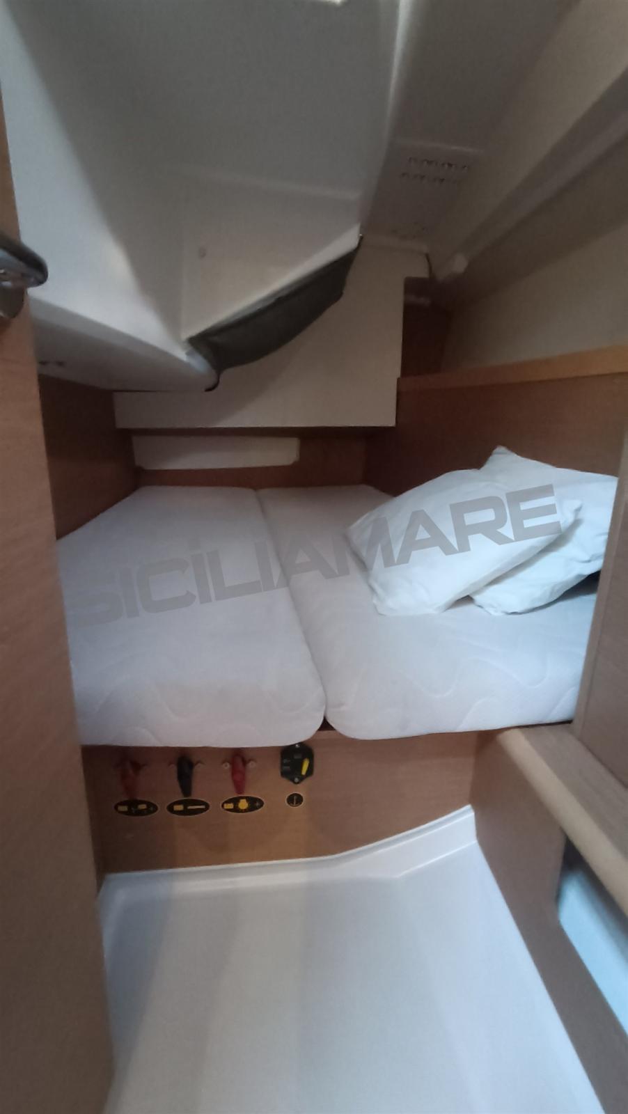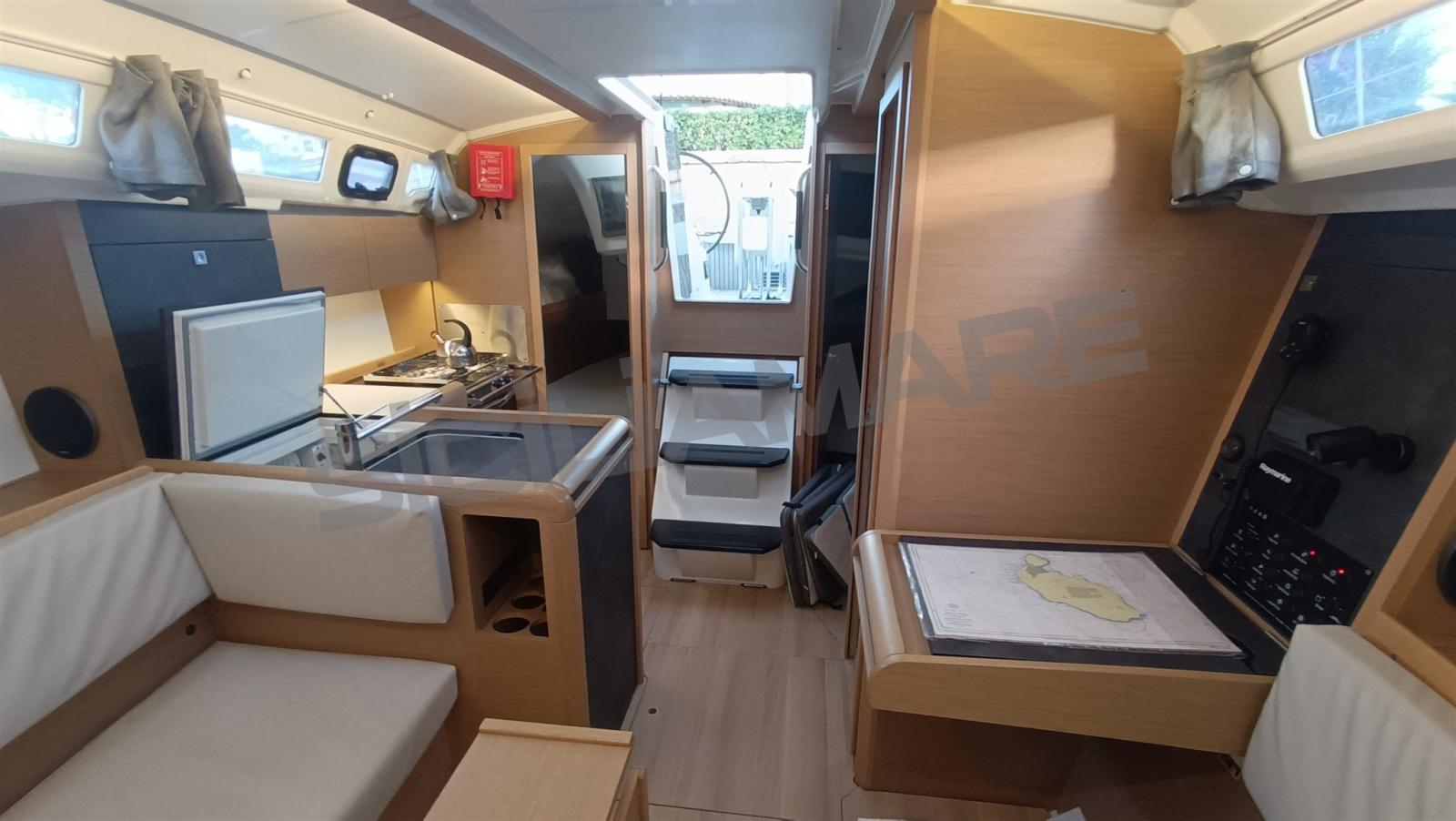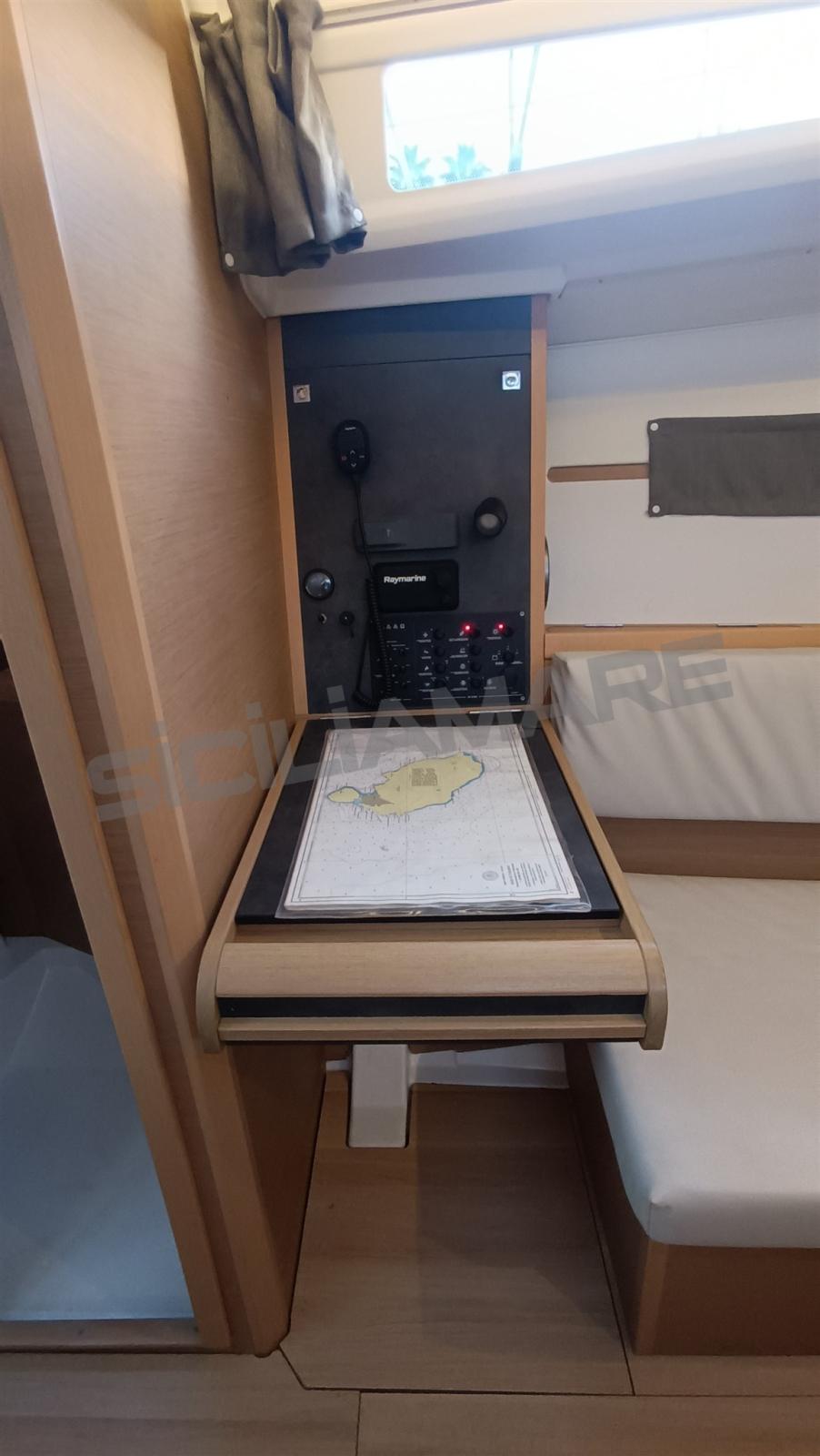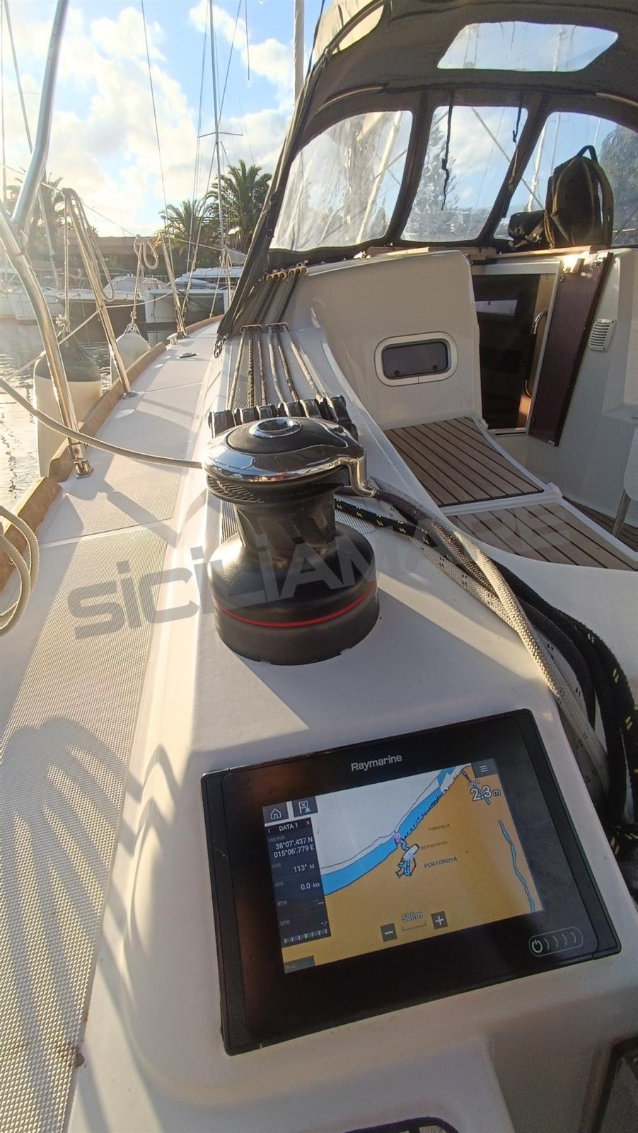 Alarme moteur, Ancre (Delta), Eau sous pression, 3 Batteries (2024), Douche de cockpit, Éclairage de courtoisie, Plateforme arrière, Pompe de cale manuelle, Cockpit en teck, Prise de quai, Guindeau électrique, Gréement monotoron, Echelle de bain, table de cockpit, 2 Winch, Windex.