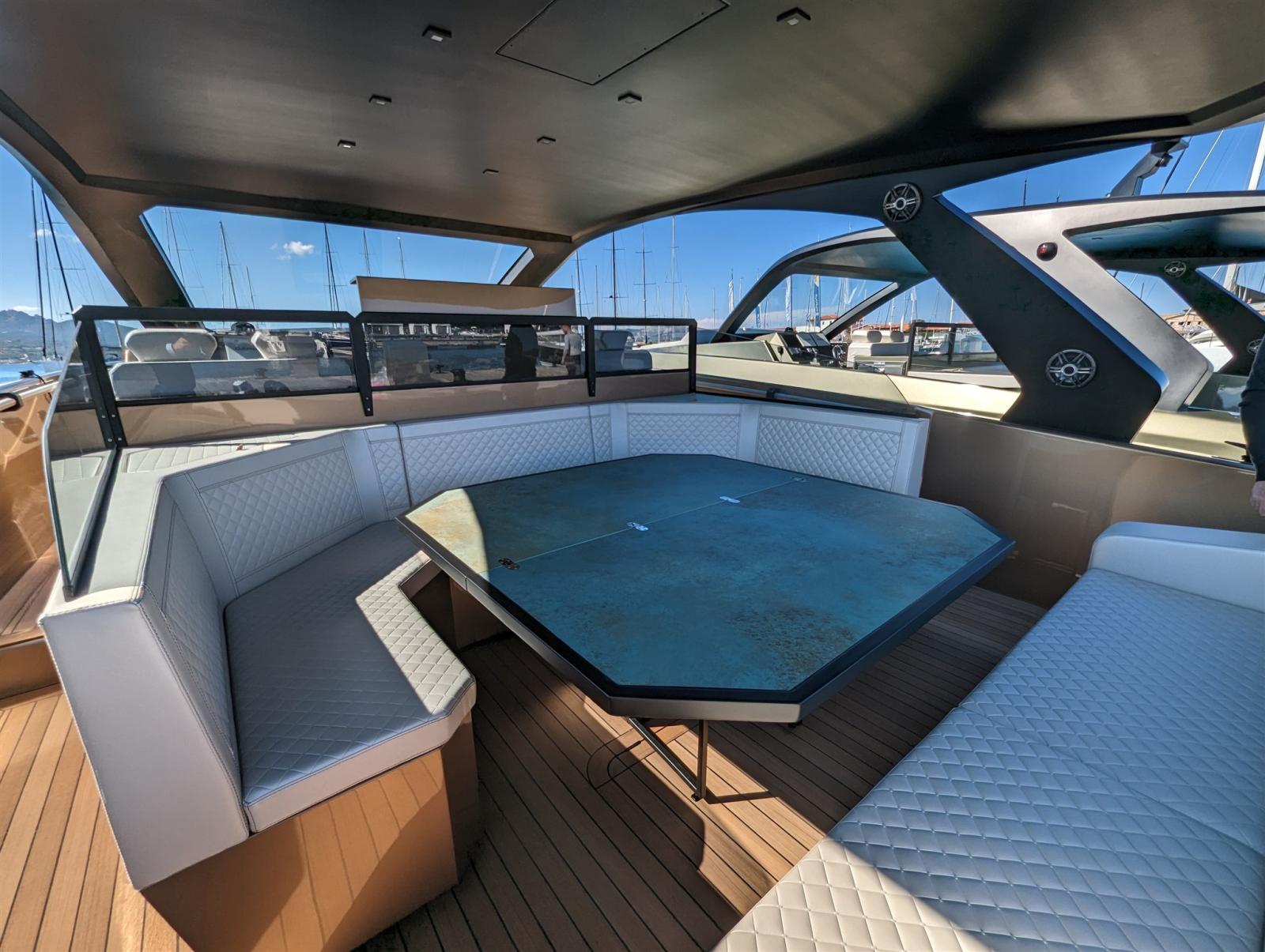 Conçu pour offrir la combinaison parfaite de performance, de stabilité, de confort et d’élégance, l’APEX 60 est l’incarnation de la philosophie du chantier. Les lignes extérieures sportives élégantes et agressives transmettent une esthétique sobre, tandis que la coque en fibre de verre et en composite et le bruit et les vibrations réduits des moteurs IPS Volvo Penta offrent la conduite la plus douce. Le revêtement traditionnel en teck accentue le design ultra-moderne des meubles et accessoires qui suivent les principes de forme et de fonction. La poupe offre un accès dégagé au bateau et une grande terrasse qui couvre les compartiments de rangement contenant tous les interrupteurs, prises et station d’accueil nécessaires. Une salle à manger et un coin salon flexibles comprennent une table réglable en hauteur et des canapés joliment rembourrés avec rangement intégré. La kitchenette multifonctionnelle peut également être couverte pour fournir des sièges supplémentaires aux invités ou un repos pour le capitaine pendant le pilotage du bateau. Une promenade confortable avec balustrades en carbone intégrées, offre un mouvement sûr à tout moment et un accès facile à la proue du bateau et à son immense solarium pour se détendre toute la journée et profiter du frisson de surfer sur les vagues.