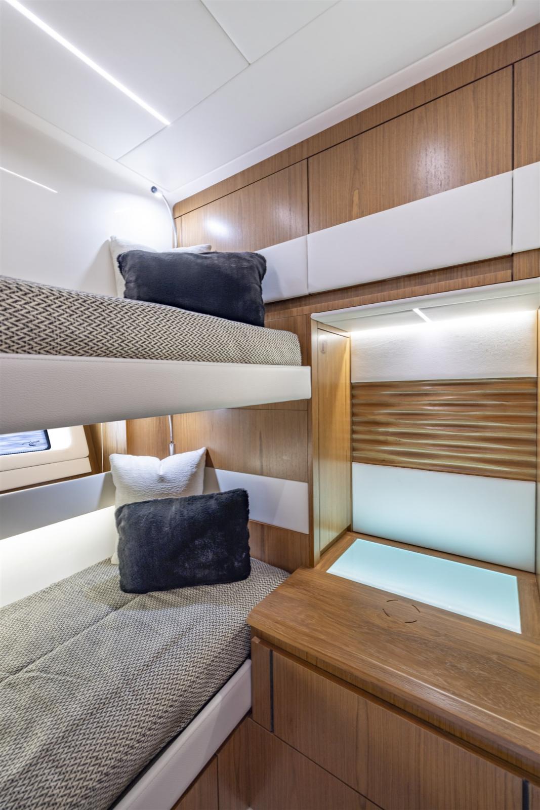 Alarme gaz, 2 Alarme moteur, Alarme de pompe de cale, Auto Dynamic Trim Interceptor, Eau sous pression, Couleur spéciale (a scelta), Douche de cockpit, Phares fixes arrière, Flaps électriques, Hard top (elettrico), Extincteur(s) fixe(s), Lavage de chaine, Lavabo dans le cockpit, Éclairage de courtoisie, Spots sous-marins, Plateforme arrière, 5 Pompe de cale automatique, Porte latérale, Porte latérale, Prise de quai, Connexion eau sous pression à quai, Onduleur, Guindeau électrique, Echelle de bain, table de cockpit, Filières avec sortie latèrale, Corne.