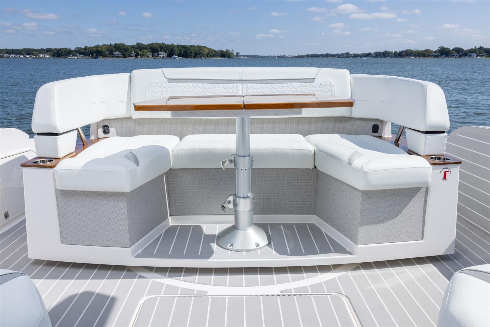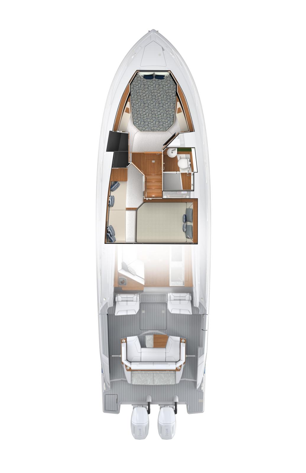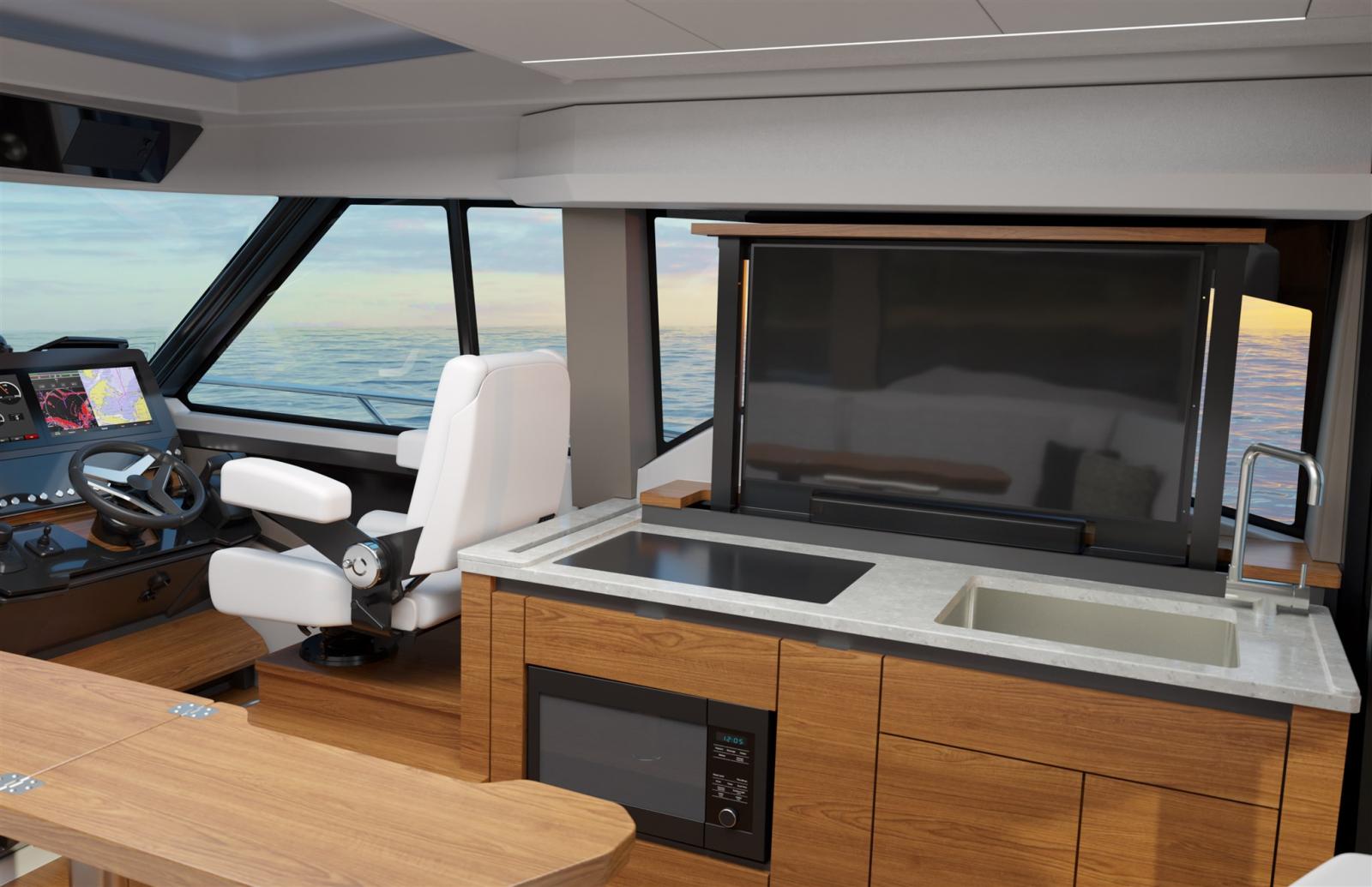 Le 43 LE offre un confort intérieur raffiné et un cockpit arrière mis à jour. Sous le pont, une cabine propriétaire privée est située à l’avant, tandis qu’une cabine d’invités au milieu de la cabine et une salle de bain privée caractérisent l’espace. Le hall et les marches mènent à l’étage supérieur, où se trouve une cuisine entièrement équipée et centralisée dans le salon. Cet espace est complété par le siège d’accompagnement bâbord convertible, qui peut être ajusté pour des sièges supplémentaires pour le dîner. Le coin salon se transforme également en couchette. Une cabine vitrée avec porte coulissante en verre et fenêtre en verre à commande électrique s’ouvre sans heurts sur le cockpit, avec une terrasse basculante pour la coque. Choisissez entre le Buffet Lounge ou le module Adventure pour adapter le cockpit à vos préférences de navigation. Le salon buffet pivotant comprend une table polie, un gril électrique et un dessus de table, tandis que le module Adventure comprend des sièges de salon rabattables, un réservoir de congélation enveloppé d’un enroulement, un puisard vivant et d’autres commodités de pêche nécessaires pour une journée mémorable sur l’eau. Contactez-nous pour plus de détails.