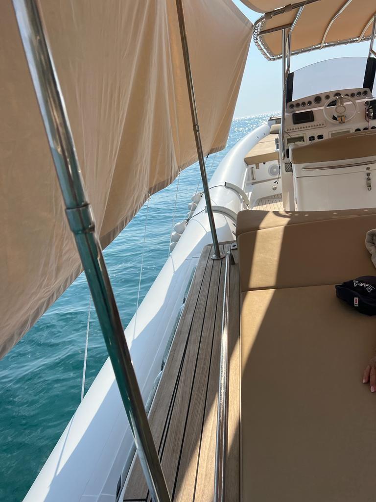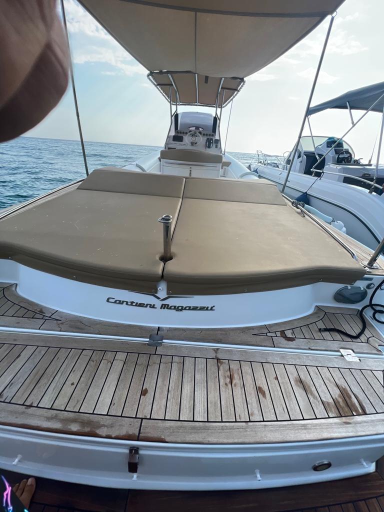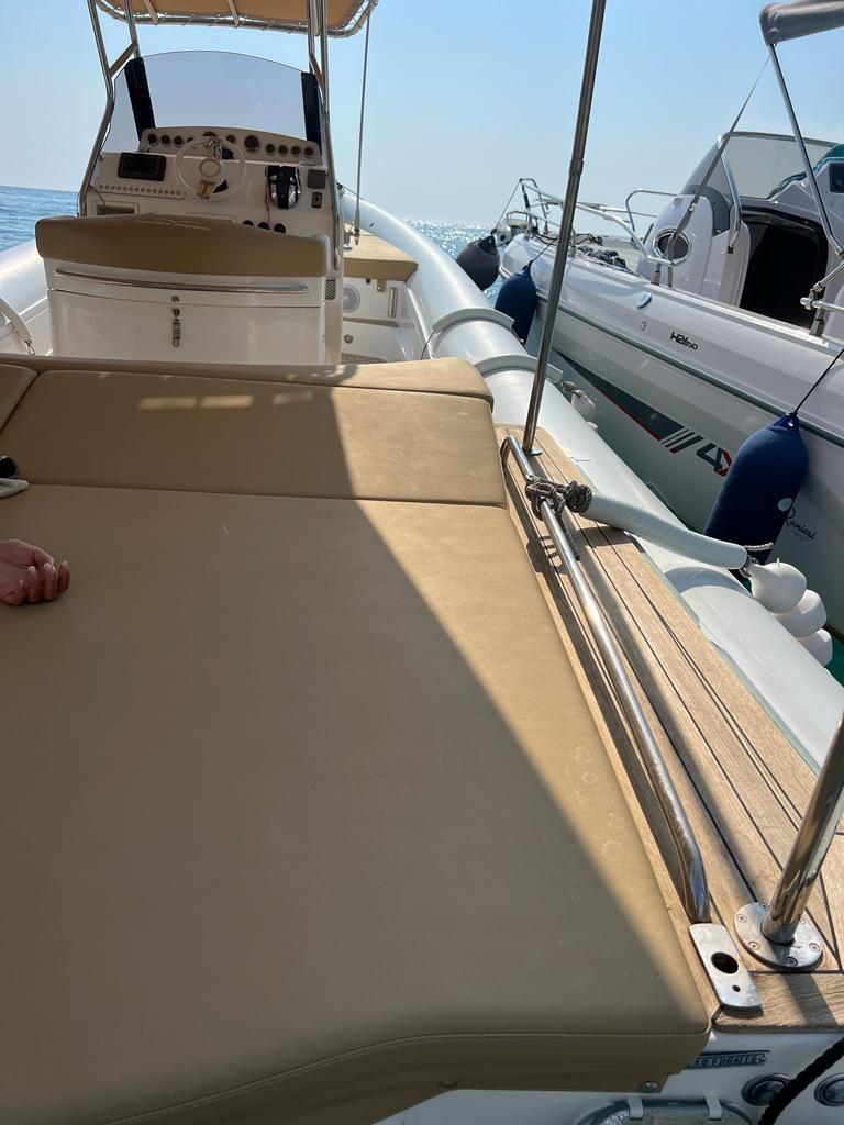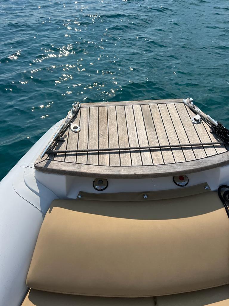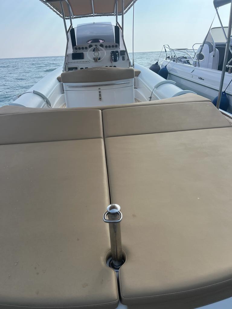 Travaux de mise à jour et de réaménagement effectués au cours des deux dernières années pour un investissement total de plus de 25 mille euros, avec toute la documentation fiscale et la facturation disponibles. En 2023, la sellerie a été entièrement refaite, remplacée par des matériaux neufs et de qualité, ainsi que de nouveaux auvents sur mesure : un pour la poupe et la zone centrale et un autre qui couvre toute la proue, pour assurer une plus grande protection et un plus grand confort. La proue a été modifiée avec une base en teck, conçue pour faciliter l’accès et le débarquement à bord. Les moteurs ont été soulevés (excavés) et soumis à une révision complète également en 2023, garantissant des performances et une fiabilité optimales. Il y a deux gonfleurs électriques à bord pour plus de confort et de sécurité lors des manœuvres de gonflage. L’annexe est également équipée d’un T-Top pratique pour s’abriter du soleil. Le prix indiqué s’entend hors honoraires d’agence.