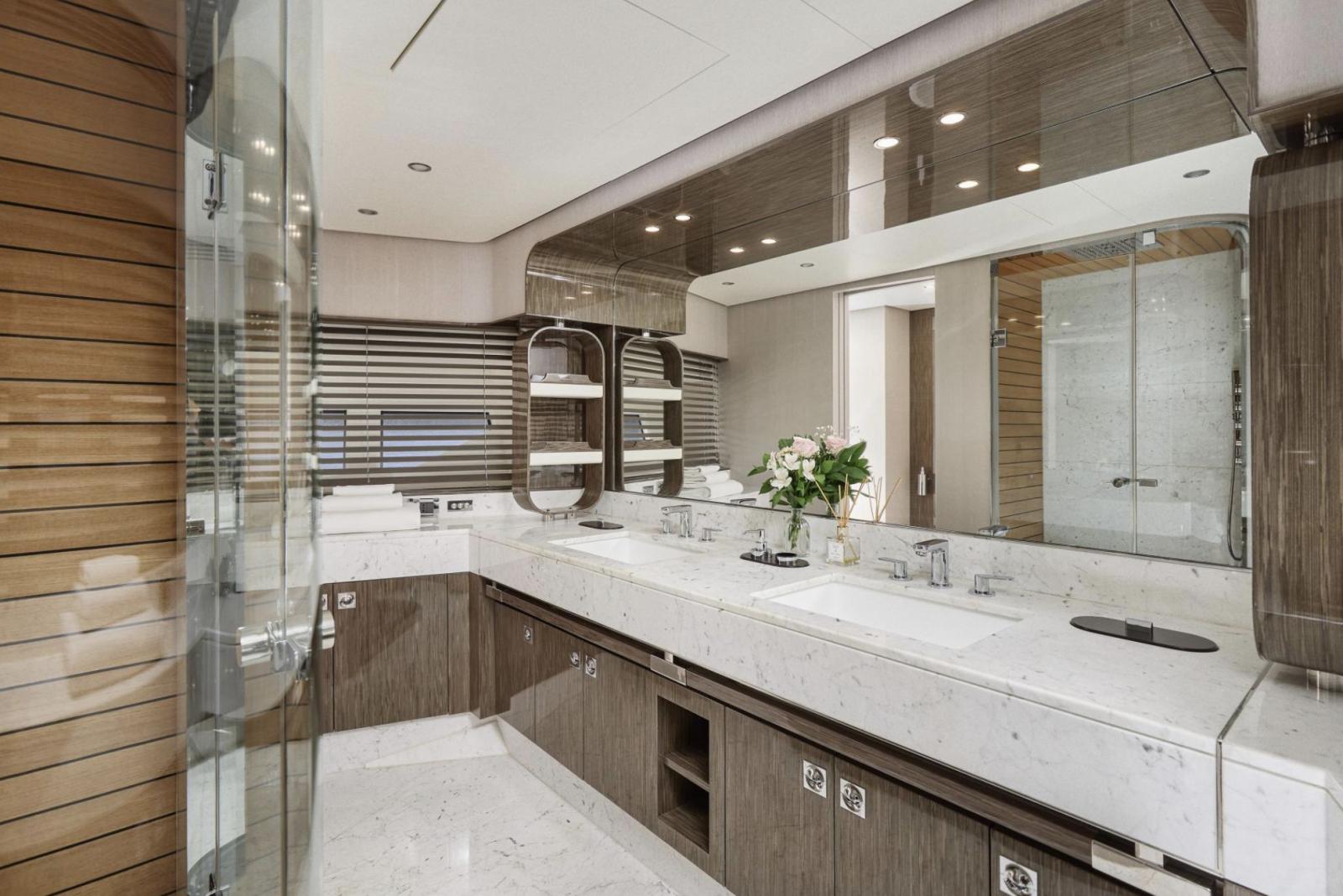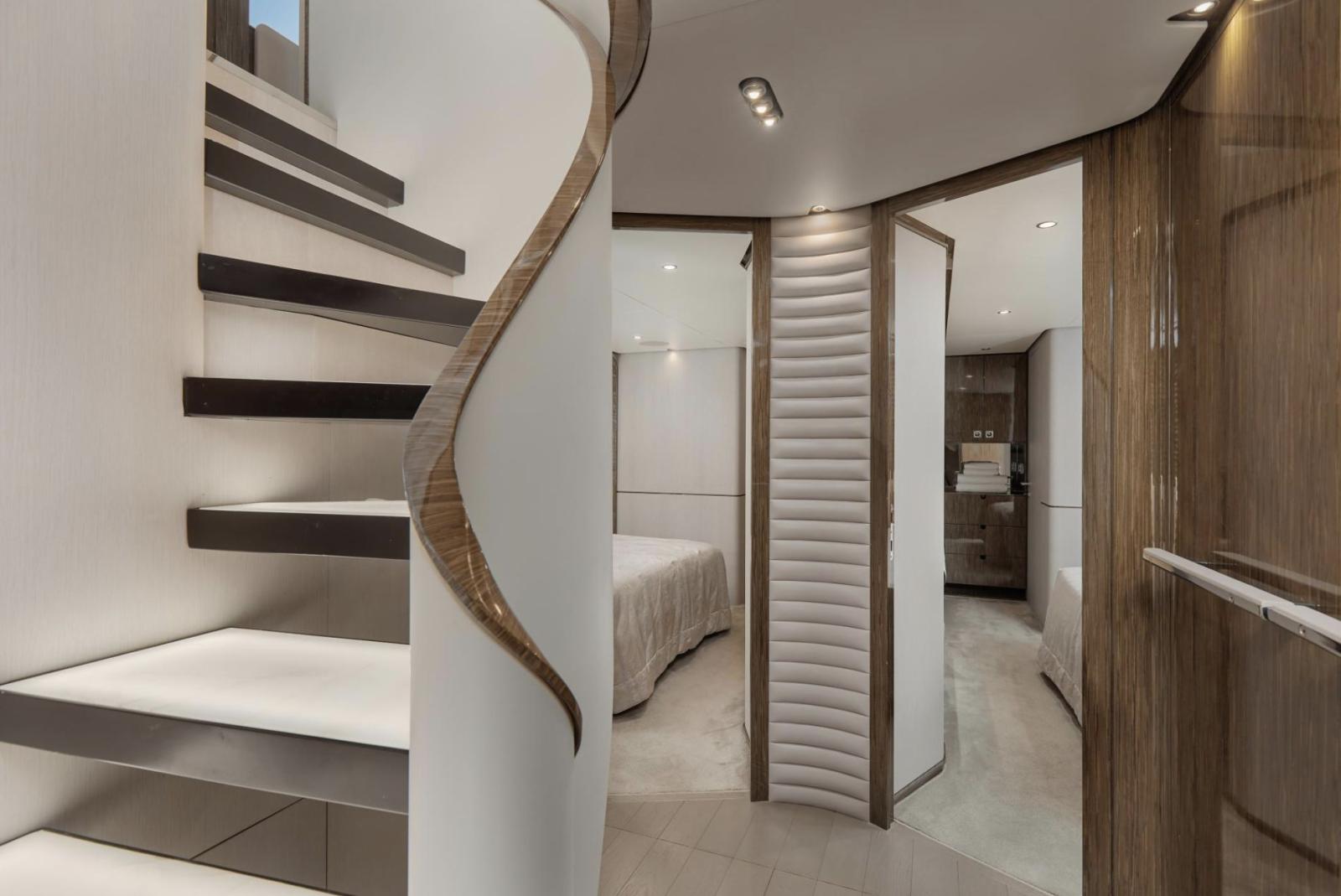 Dès la montée à bord, vous serez séduit par son aménagement élégant et son sens du détail. Le spacieux salon du pont principal reflète le meilleur du style italien moderne, mêlant tons neutres et touches de rouge raffinées. Les parquets en chêne argenté, les armoires en cuir et les tables en verre créent une atmosphère chaleureuse et sophistiquée, tandis qu’un système de divertissement AV/IT haut de gamme garantit une expérience immersive et fluide dans l’ensemble du yacht.